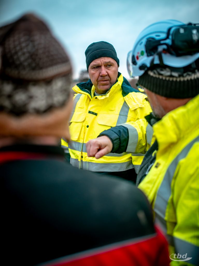 Während Knut unten Muffe um Muffe verbindet, rücken oben die Köpfe zusammen: René, Leiter unseres Projektbüros und Rohrleitungsbauermeister, Polier Jan, sowie der Vertreter der Stadtwerke und der Gesamtbauleiter des Generalunternehmers. Sie ziehen im Herbstregen die Kragen enger und stimmen sich taktisch ab.