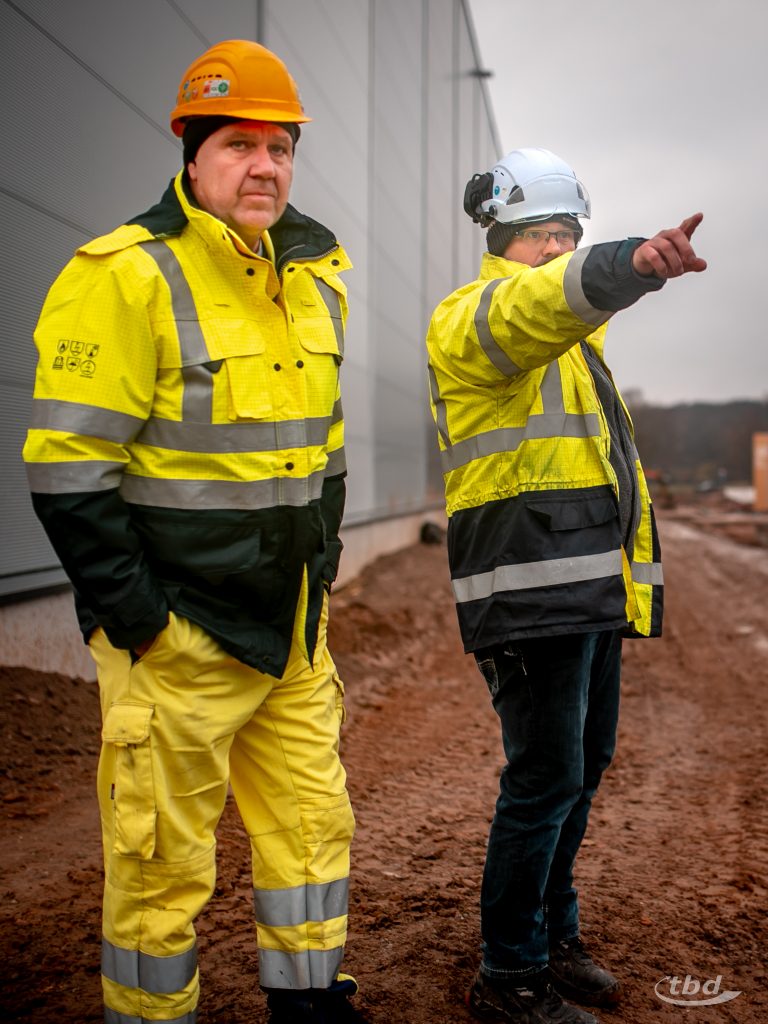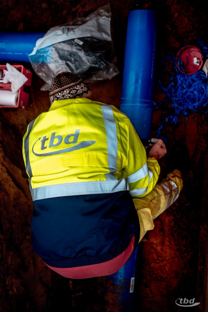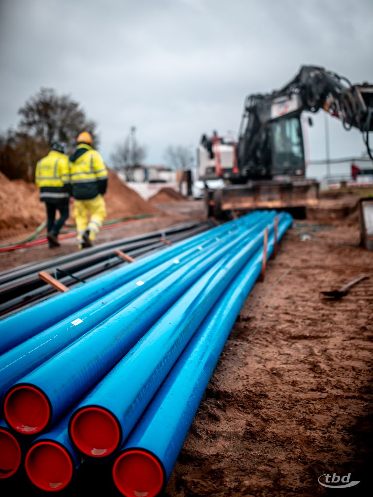 Ein Projekt, das im Spätherbst umso herausfordernder ist: Böen beißen und peitschen eisigen Regen übers Land, der Boden weicht auf, verwandelt sich in Schlamm, der sich an die Arbeitsschuhe klammert und jeden Schritt beschwert. Ein umso größeres Dankeschön an unser Team, das trotz widrigster Bedingungen alles gibt. Ebenso ein Dank an die Partner, mit denen das Miteinander reibungslos funktioniert. Und während die Verantwortlichen oben über schwierige Bodenverhältnisse, Termindruck und andere Herausforderungen diskutieren, verliert Knut keine großen Worte. Wischt den Regen von der Brille, setzt die nächste Muffe an. Und Totti reicht ihm das Schweißwerkzeug.