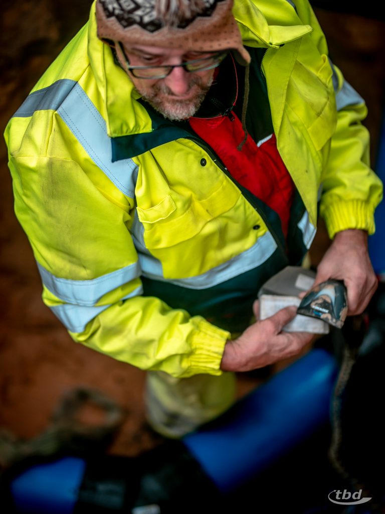 Also muss unser Kollege Knut über ein Wirrwarr aus Glasfaser-Leerrohren hinweg durch die Enge klettern, bevor er die Säbelsäge ansetzt, um die Kappe eines 200er Rohrs abzutrennen und danach das Ende abzuschmirgeln – damit dort das nächste Rohrstück angesetzt und verschweißt werden kann.