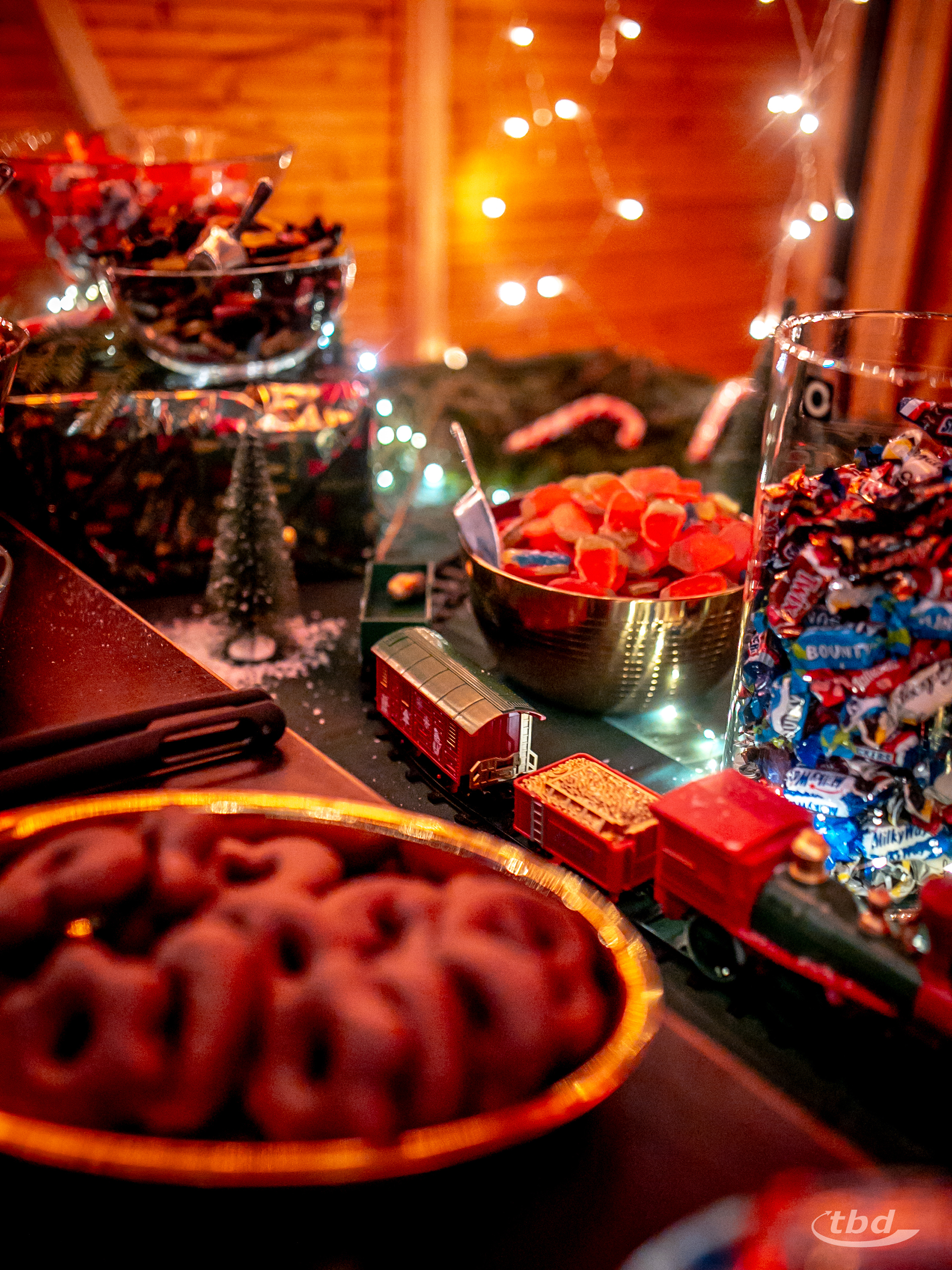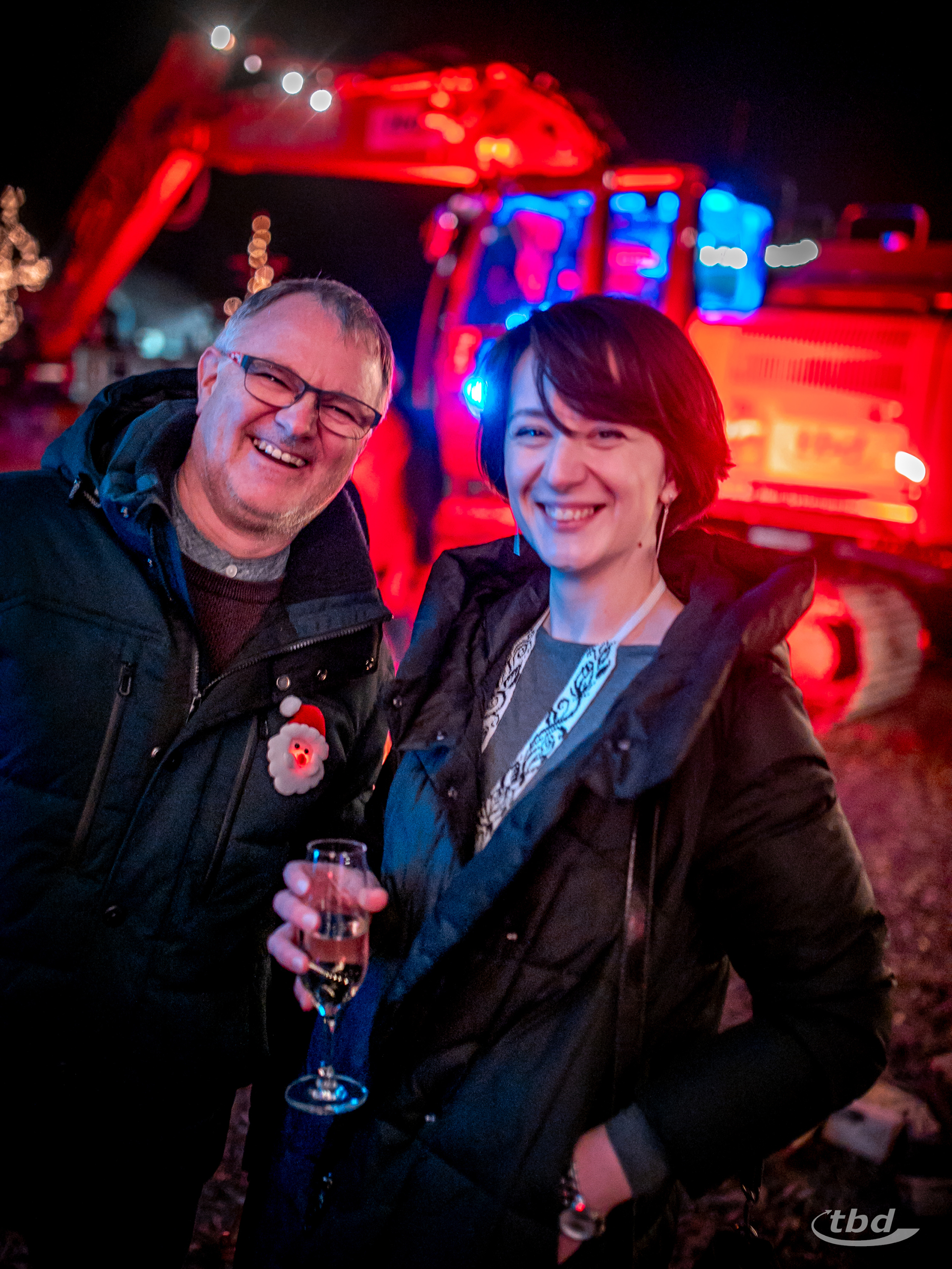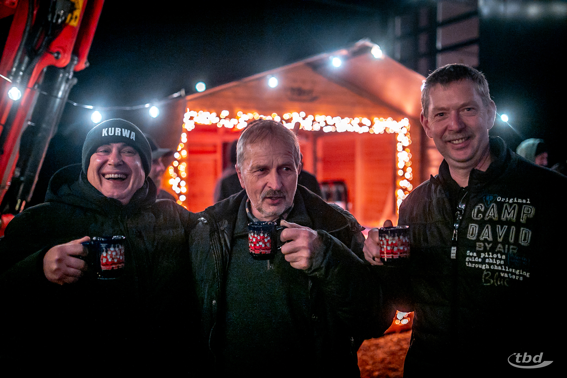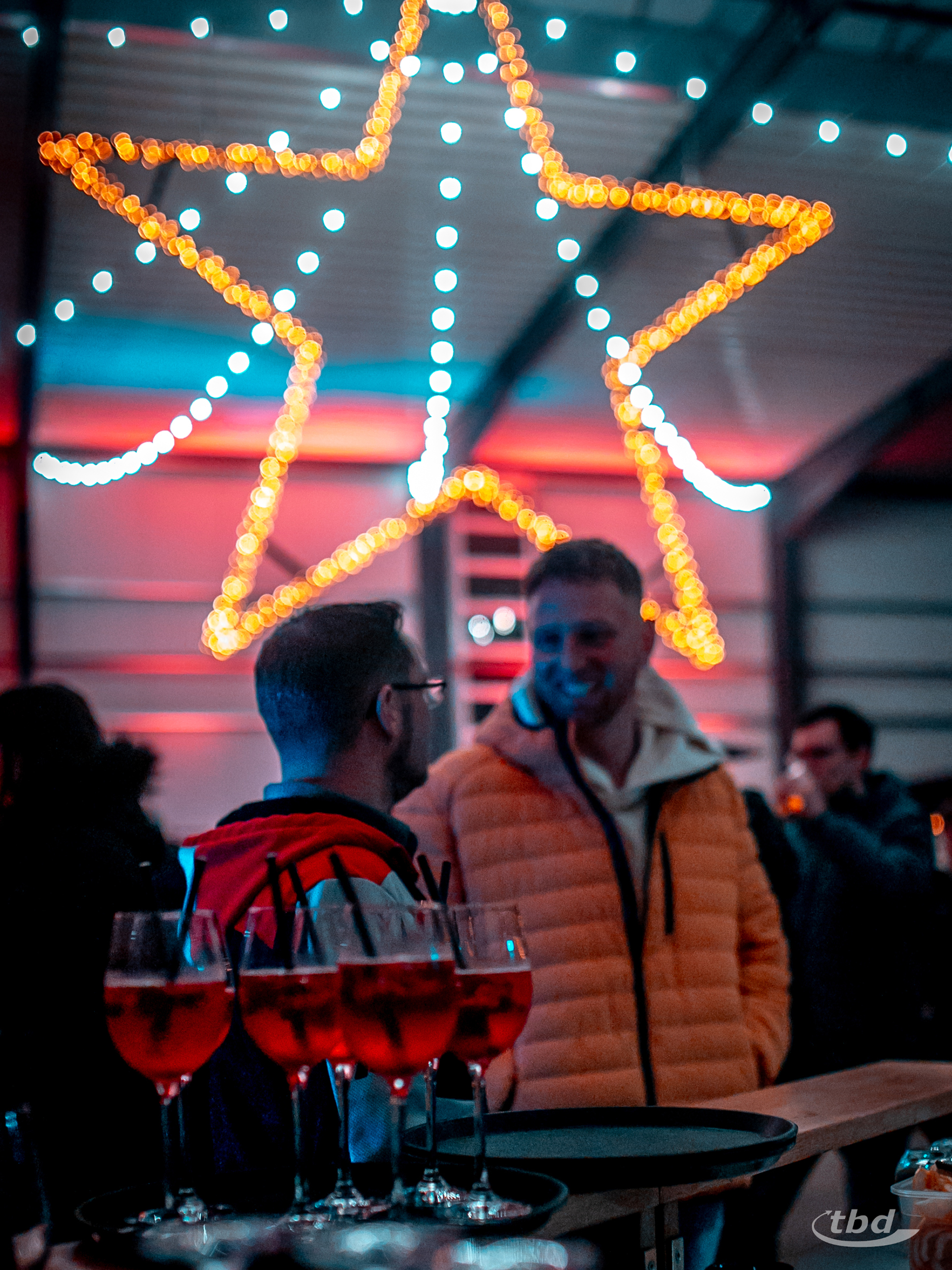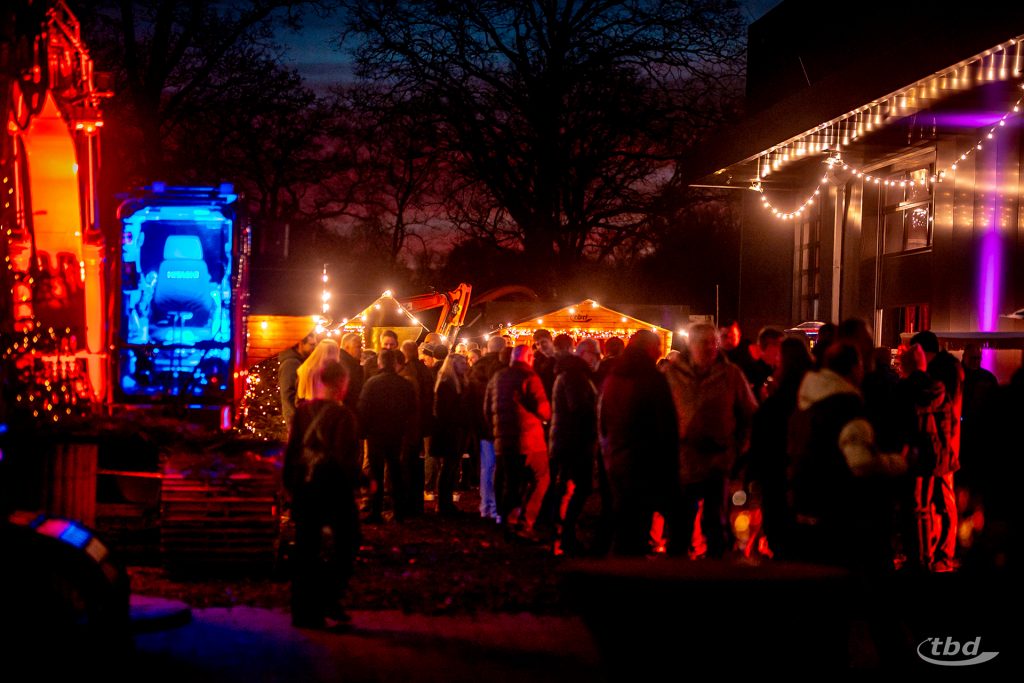 Strahler tauchen den funktionalen Bau in festliches Licht, vor den Rolltoren ragen geschmückte Weihnachtsbäume auf. Bagger leuchten festlich. Dazwischen drängen sich mit Lichterketten geschmückte Holzbuden: Tombola-Geschenke, ein Süßigkeitenstand, in dem ein kleiner Zug munter Runden dreht, frisch gebackene Crêpes sowie heißer Glühwein und Apfelpunsch dampfen. Wer mag, kann sich auf Strohballen niederlassen – oder an den Lagerfeuern wärmen, die in Feuerschalen flackern. Und drinnen: edle Vorhänge, kleine Gestecke, ein riesiger leuchtender Stern hoch über den Köpfen – selbstverständlich sicher befestigt.