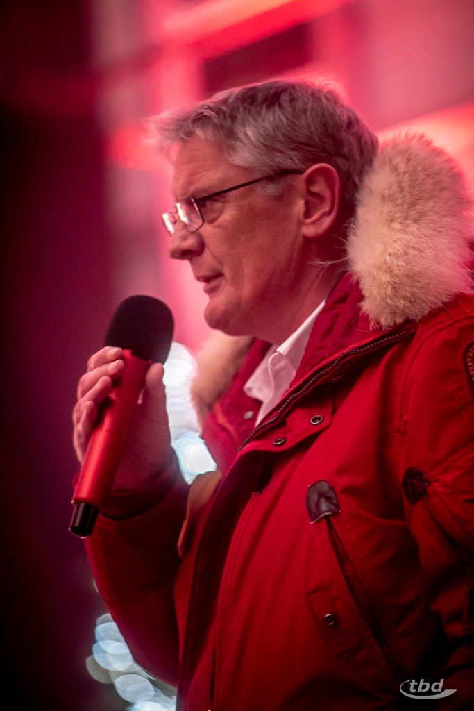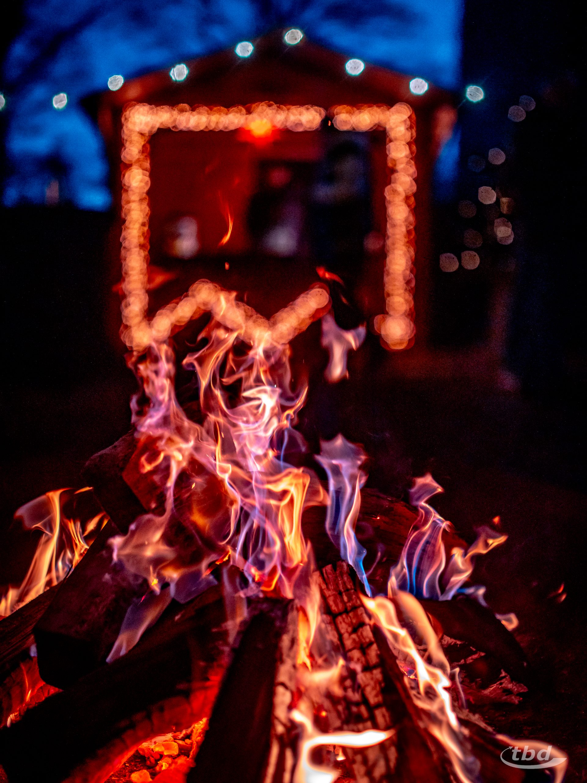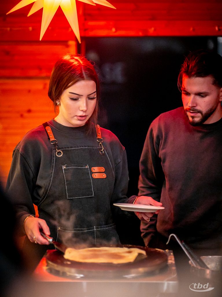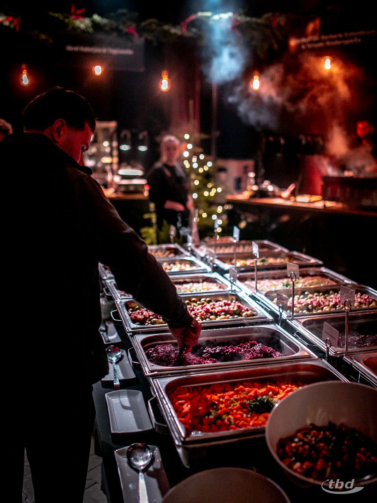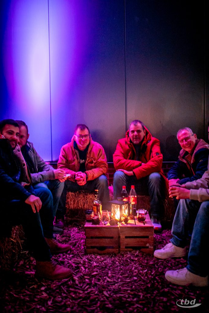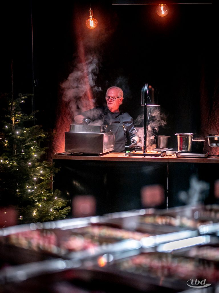 Strahler tauchen den funktionalen Bau in festliches Licht, vor den Rolltoren ragen geschmückte Weihnachtsbäume auf. Bagger leuchten festlich. Dazwischen drängen sich mit Lichterketten geschmückte Holzbuden: Tombola-Geschenke, ein Süßigkeitenstand, in dem ein kleiner Zug munter Runden dreht, frisch gebackene Crêpes sowie heißer Glühwein und Apfelpunsch dampfen. Wer mag, kann sich auf Strohballen niederlassen – oder an den Lagerfeuern wärmen, die in Feuerschalen flackern. Und drinnen: edle Vorhänge, kleine Gestecke, ein riesiger leuchtender Stern hoch über den Köpfen – selbstverständlich sicher befestigt.