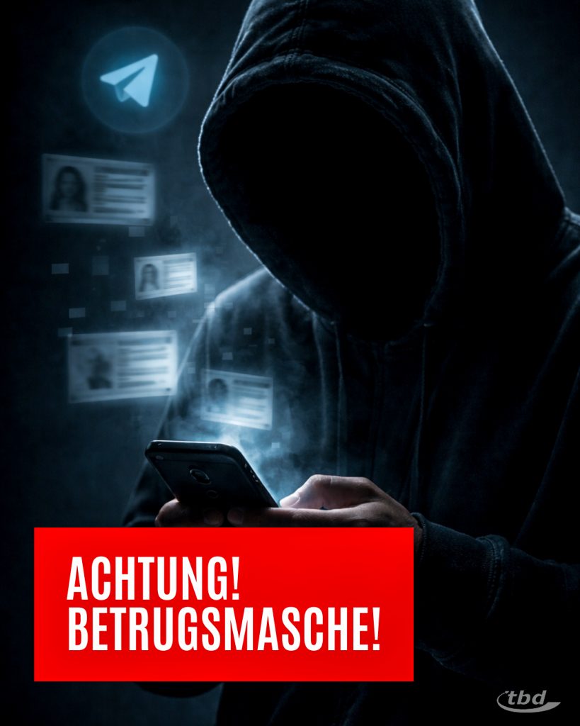 Achtung Betrugsmasche! Aktuell erreichen uns Hinweise, dass Unbekannte unseren Firmennamen missbrauchen – womöglich mit dem Ziel, an sensible Personen- und Bankdaten zu gelangen. Dabei locken sie über den Messenger-Dienst Telegram als angebliche Partner von tbd mit unseriösen Nebenjob-Angeboten. Wir stehen in keiner Verbindung dazu und haben der Polizei den Vorfall gemeldet.