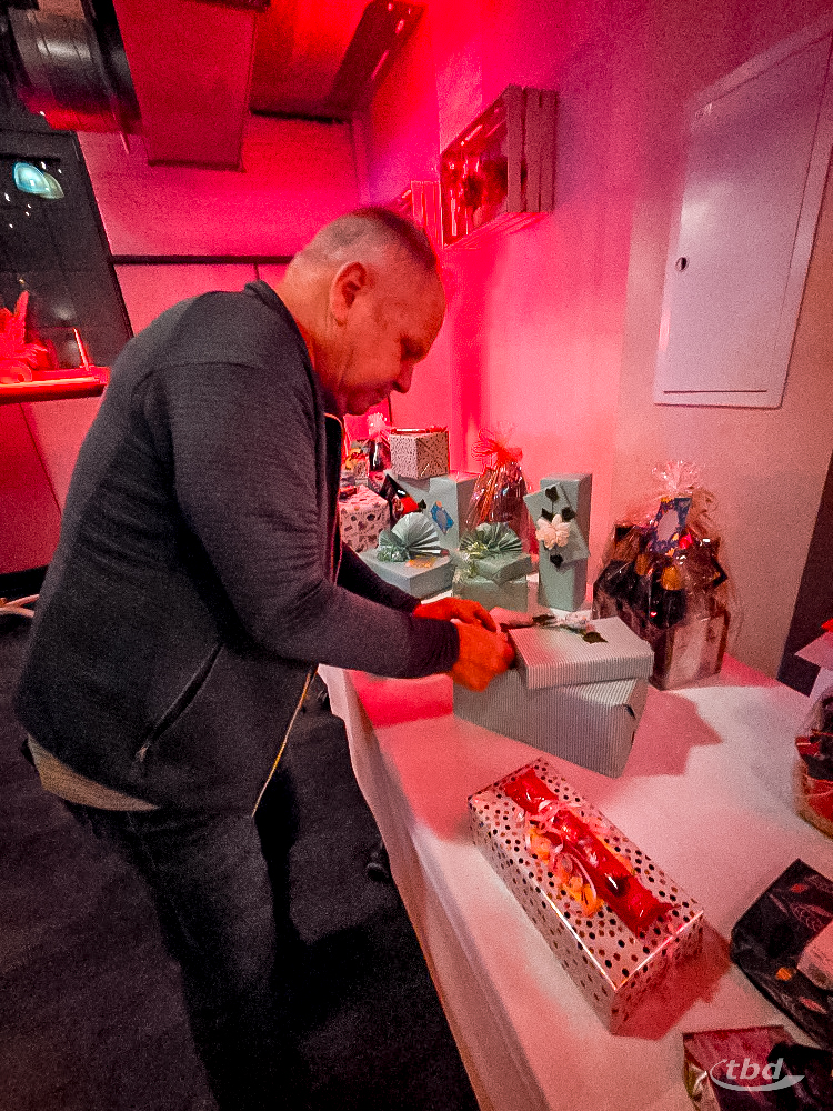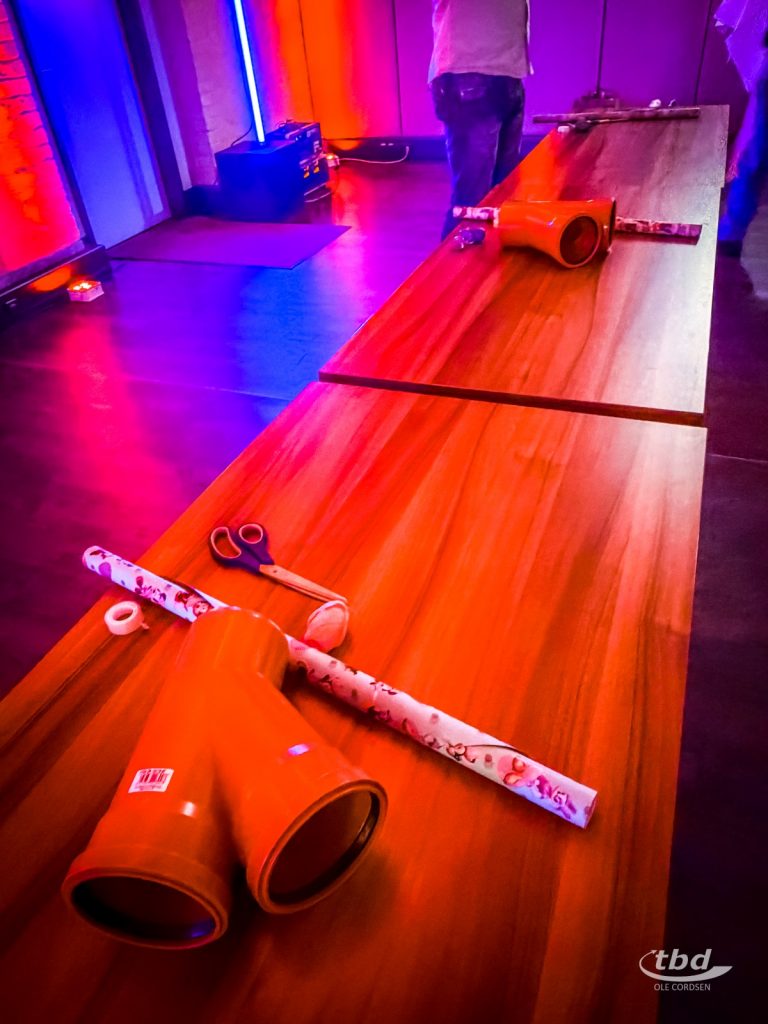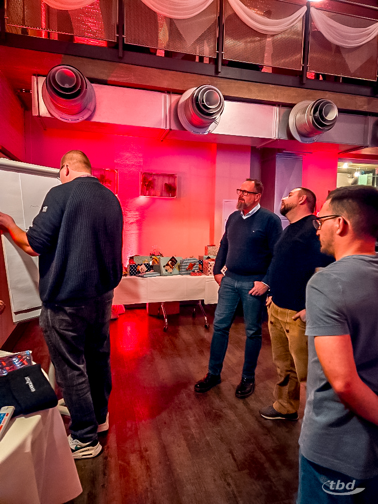 Gemeinsam haben wir geschlemmt, aber auch gespielt. Und dabei sogar noch mehr Geschenke eingepackt: Schließlich ging es unter anderem darum, KG-Rohrstücke so geschickt, schnell und schön wie möglich einzupacken. Gibt es Schöneres auf einem Geschenketisch als ein kunstvoll in Papier drapiertes Stück Leitung? Eine mit Stoppuhr und viel optischem Feinsinn ausgestattete Jury hielt dann wie beim Eiskunstlauf Täfelchen mit Punktzahlen hoch.