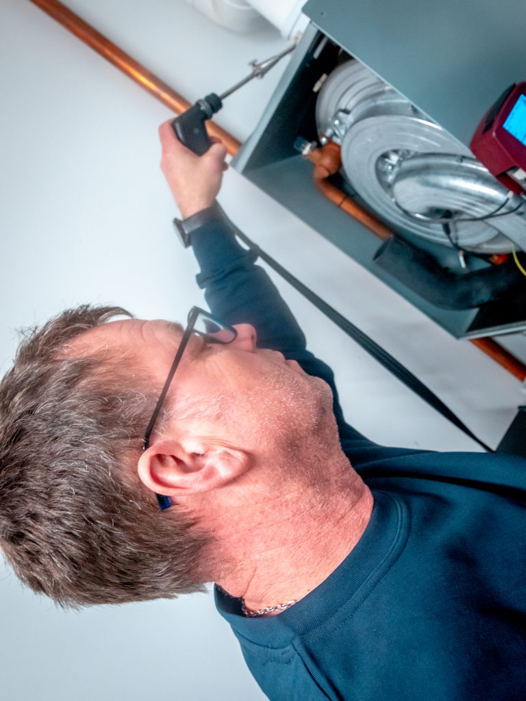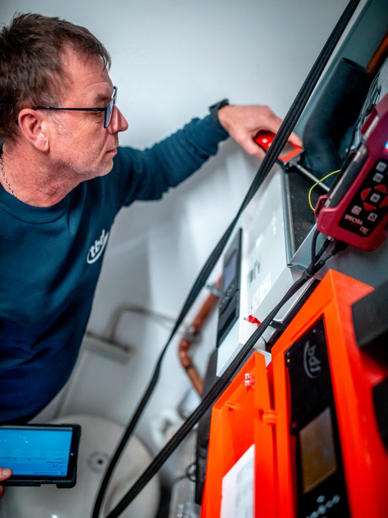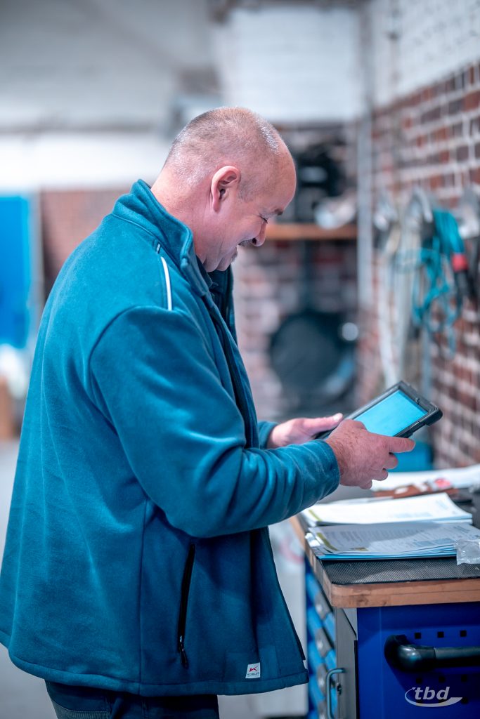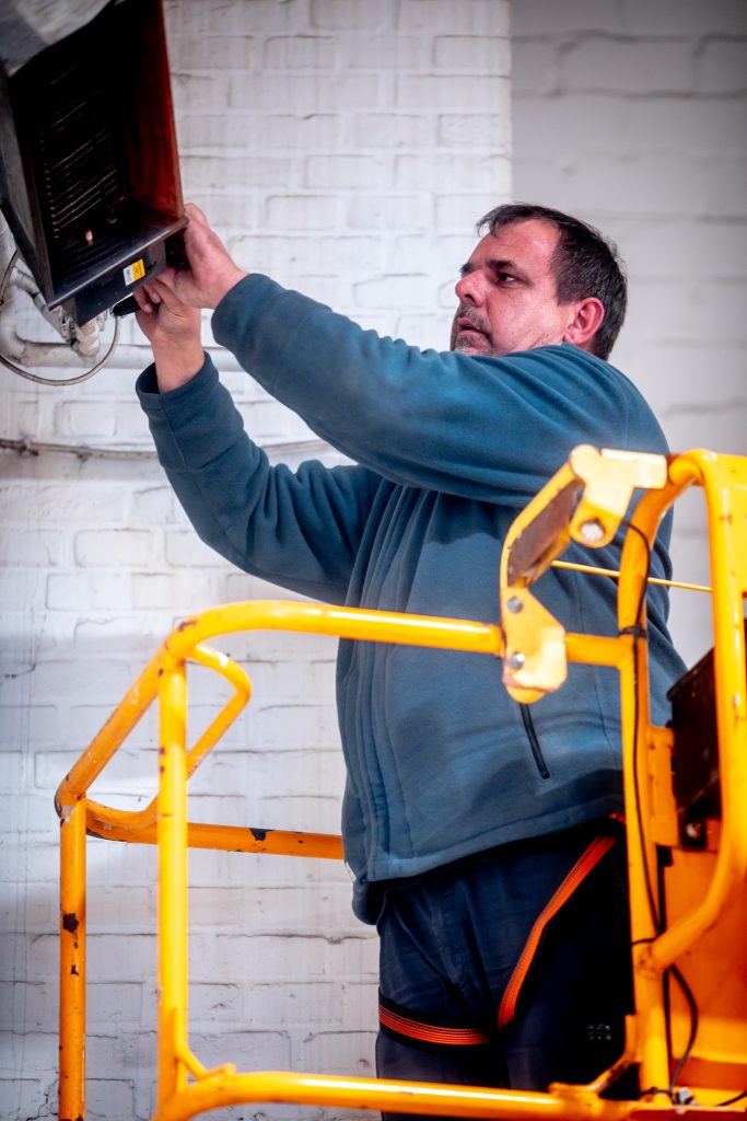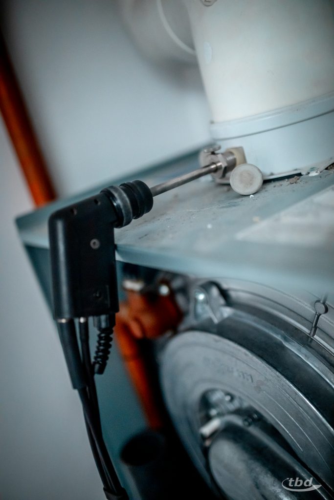 Genau deshalb kommen Theo, Dietmar und ihre Kollegen immer zweimal. Jetzt, im ersten Schritt, hat Theo vor allem hoch empfindliche Gas-Messgeräte und ein Tablet mit Kamera im Korb. „Mit der Messtechnik erfasse ich die Abgaswerte – wie sauber das Gerät verbrennt, bei Niedrig- und Volllast. Und dann fotografiere ich die Messwerte, aber auch das Typenschild: Das ist wichtig, damit später die richtige Düse eingebaut werden kann.“ Für jeden einzelnen Dunkelstrahler, für jedes einzelne Gasverbrauchsgerät muss Theo das machen.