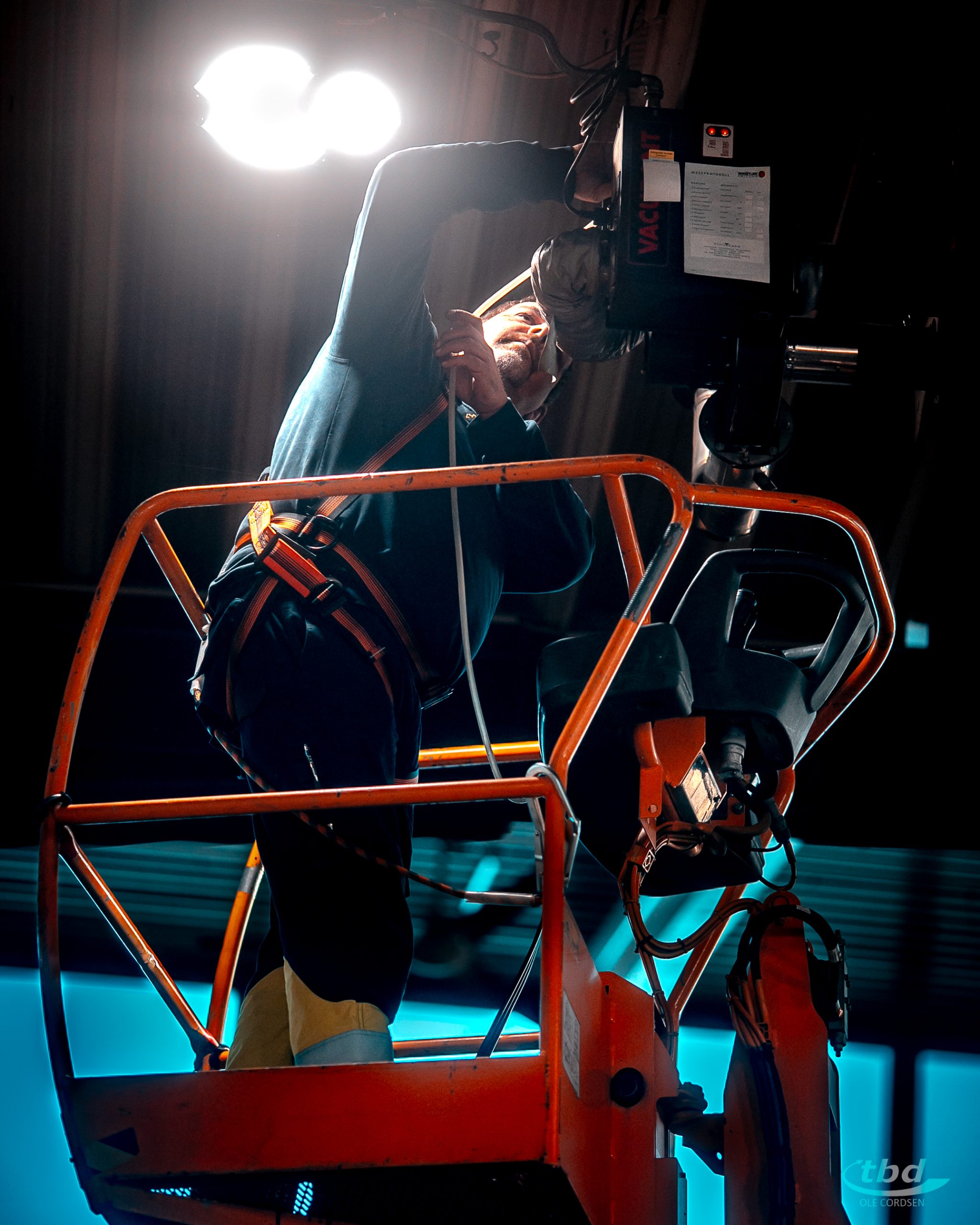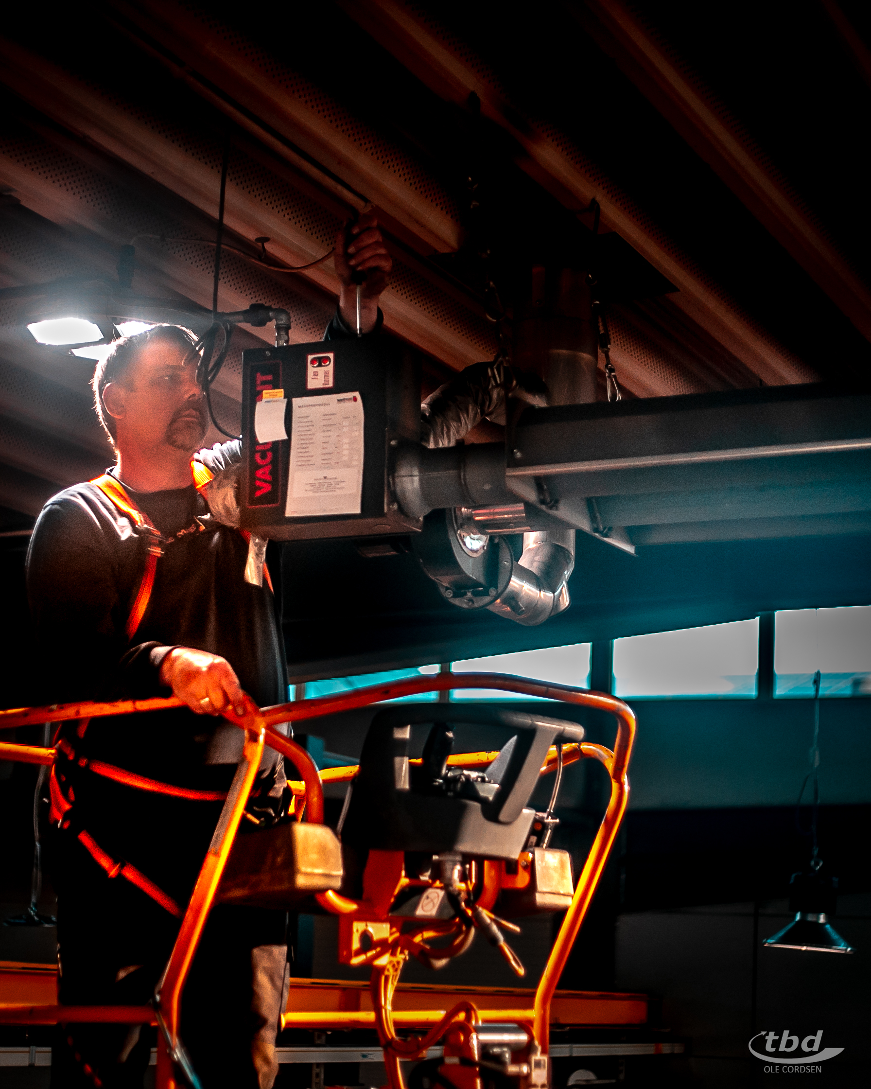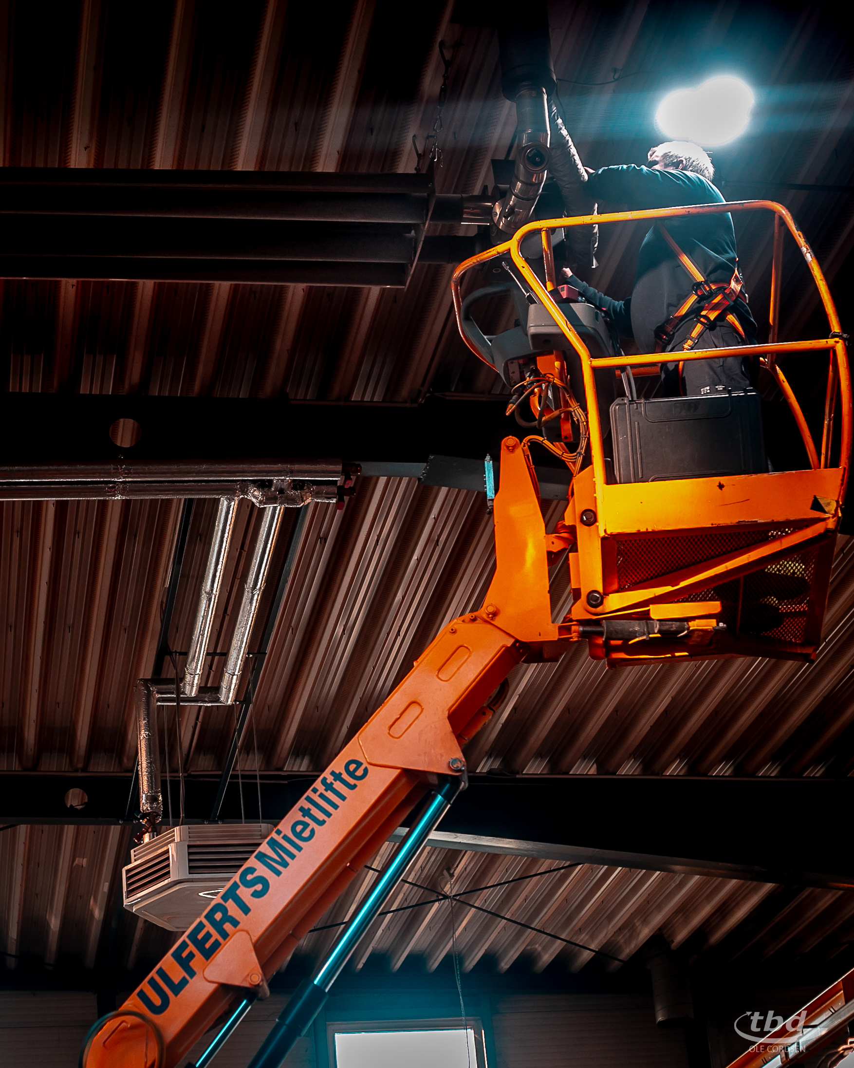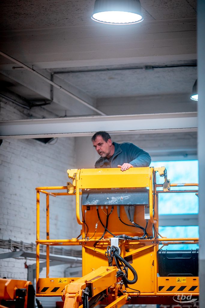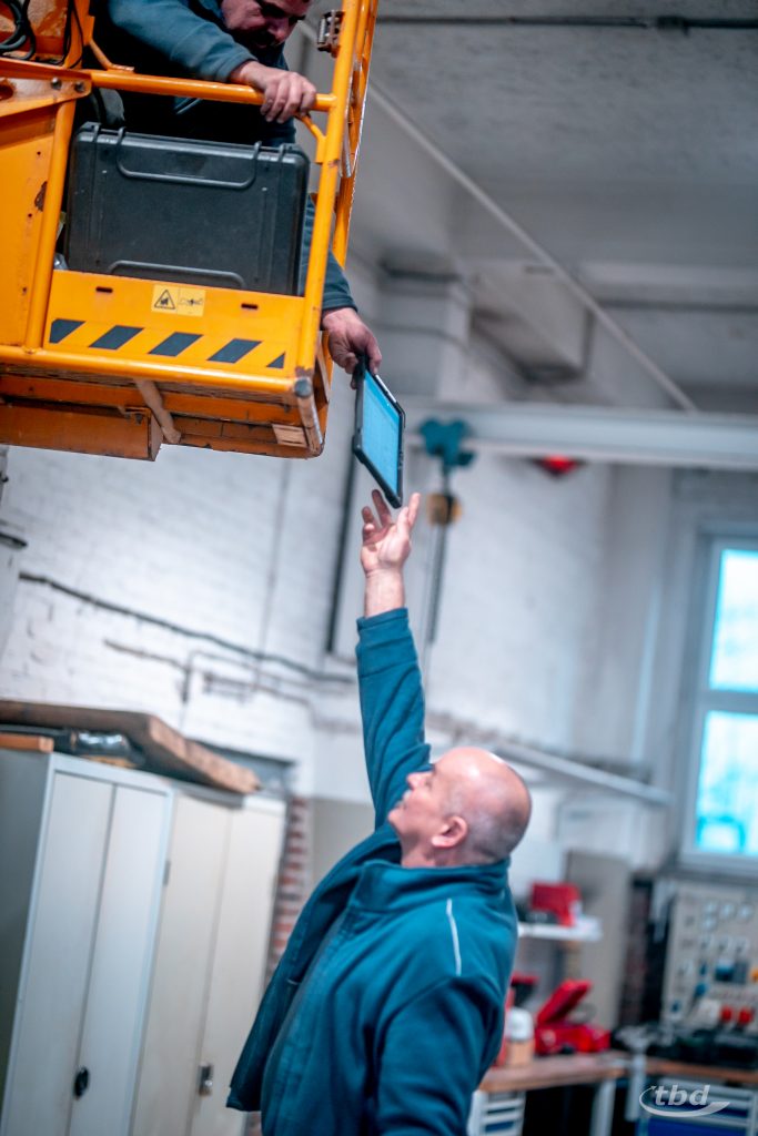 Während der schwindelfreie gelernte Heizungsbauer oben in der Kanzel gut gesichert mit Messgeräten und Kamera hantiert, übernimmt Dietmar unten die Dokumentation – und hat zugleich immer ein Auge auf seinen Kollegen: „Ich passe auf, dass nichts passiert. Ich passe auf Theo auf – falls gesundheitlich was sein sollte, oder die Hebebühne spinnt, bin ich da. Und zwischendurch müssen die Geräte auch ein- und ausgeschaltet werden. Das kann ich leichter und schneller von unten regeln, als wenn Theo jedes Mal dafür runter- und wieder rauffahren müsste.“ Von der Hilfe beim Rangieren zu schweigen. Dutzende Male wiederholt sich der Ablauf in der Werkshalle – und immer wieder rangieren Theo und Dietmar sorgsam, während unten die Produktion weiterläuft.