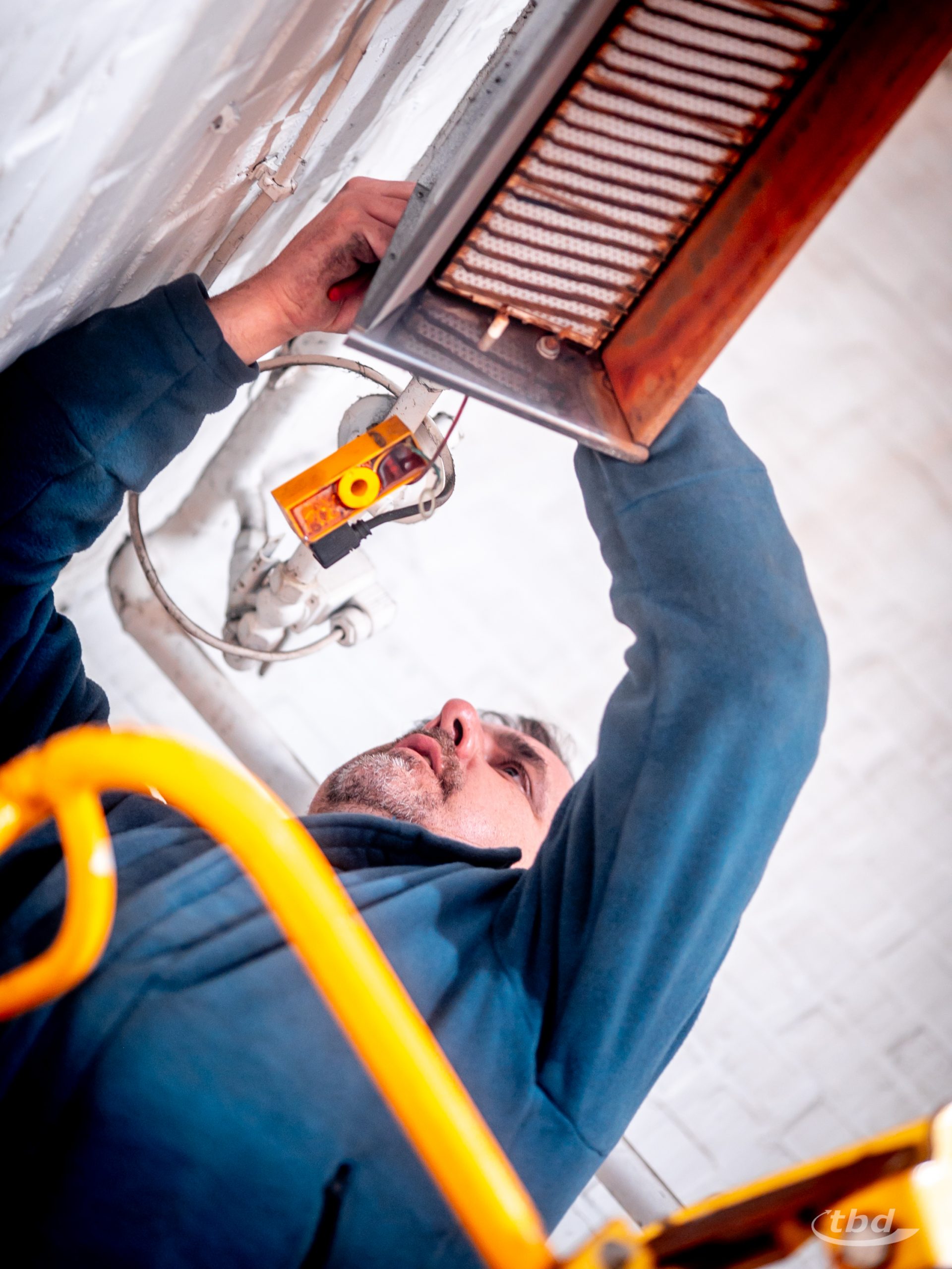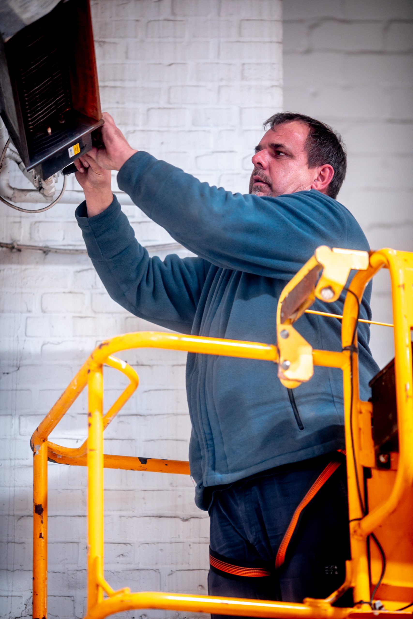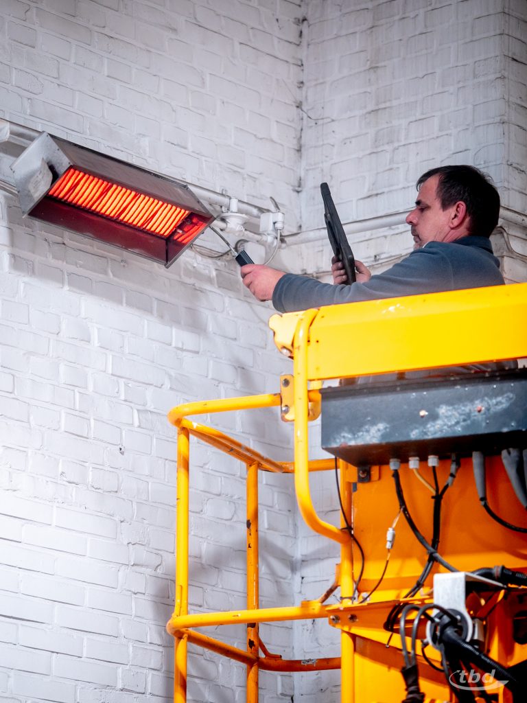 Während die Erfassung in der Produktionshalle frisch erledigt ist, sind Dietmar und Theo jetzt bei einer Werkstatt im Einsatz: Dort waren die beiden schon im vorigen Jahr, und diesmal hat Theo neben Messgerät und Tablet mit Kamera auch noch passendes Werkzeug – Maulschlüssel, Schraubendreher, Pumpenzangen, falls Verschraubungen festsitzen – und neue Düsen im Gepäck. Auch hier hängen die Dunkelstrahler luftig hoch. „Zum Glück ist es hier aber nicht so eng, hier hat man mal wirklich Platz“, sagt Theo. Er setzt das Werkzeug an, entfernt vorsichtig die alte Düse, setzt die neue ein, verschraubt alles sorgsam, nimmt das Messgerät, „schnüffelt“ alle Verbindungen ab: sichergehen, dass auch alles dicht ist und kein Gas entweicht. „Schalt‘ mal ein“, ruft Theo nach unten. Wenig später glüht der Strahler auf. Theo greift sich das Messgerät erneut, nimmt Abgaswerte. „Passt!“, ruft er kurz darauf nach unten. Auf zum nächsten Strahler – in dieser Werkstatt sind es noch drei. Und morgen die nächste Halle, die nächste Düse, der nächste Kunde. Bis 2027.