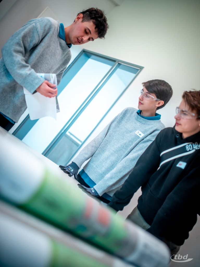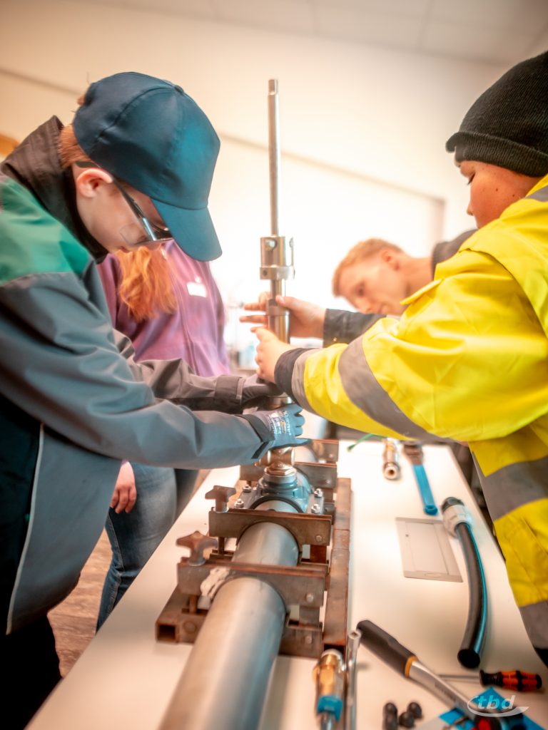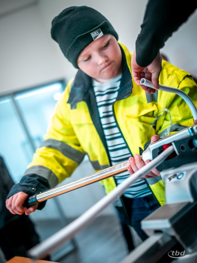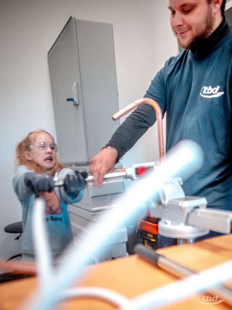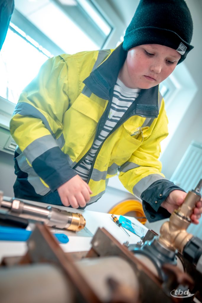 Und nun ging’s los. Gemeinsam mit unserem Haustechnik-SHK-Azubi Jannick konnten die Kinder Kupfer- und Alu-Verbund-Rohre biegen – was im Arbeitsalltag wichtig ist, wenn Heizungsrohre Hindernisse umkurven müssen. Parallel zeigte unser Projektleitungs-Trainee Johann, wie man ein Wasserrohr unter Druck anbohrt, ohne dass das kühle Nass durch die Gegend spritzt, und bei unserem angehenden Bauzeichner Joseph konnten die Kinder lernen und ausprobieren, wie Profis Baupläne richtig falten.