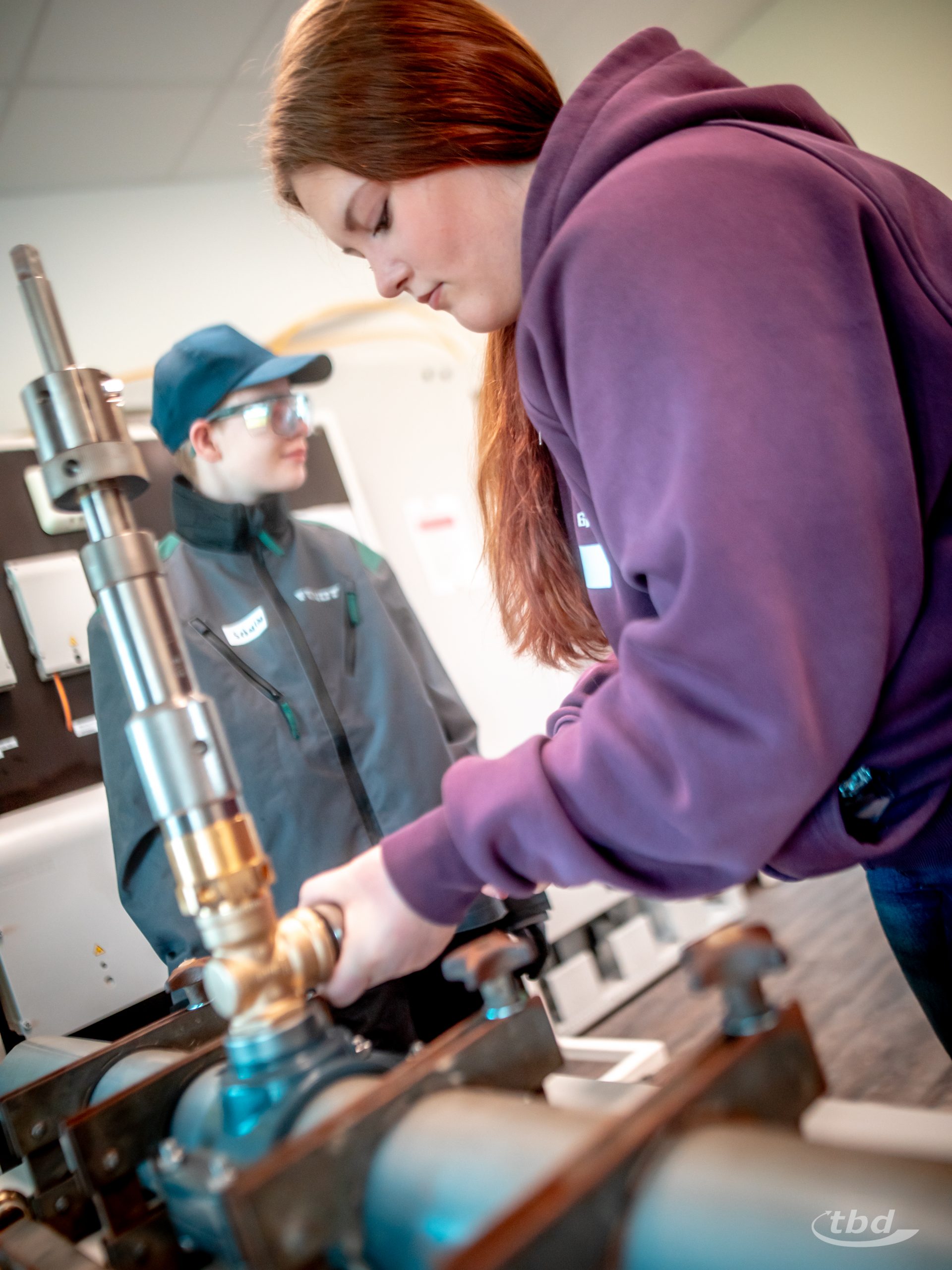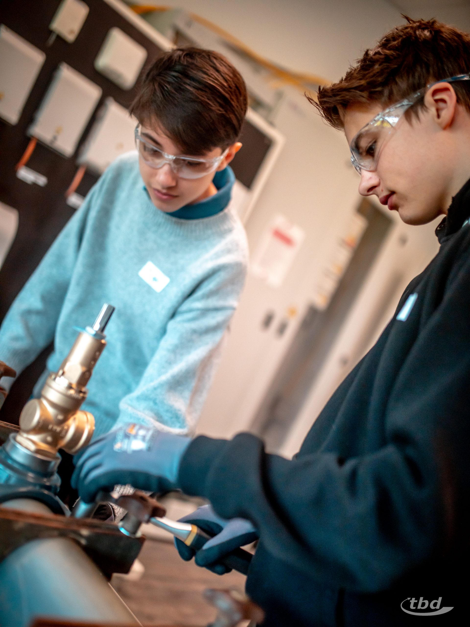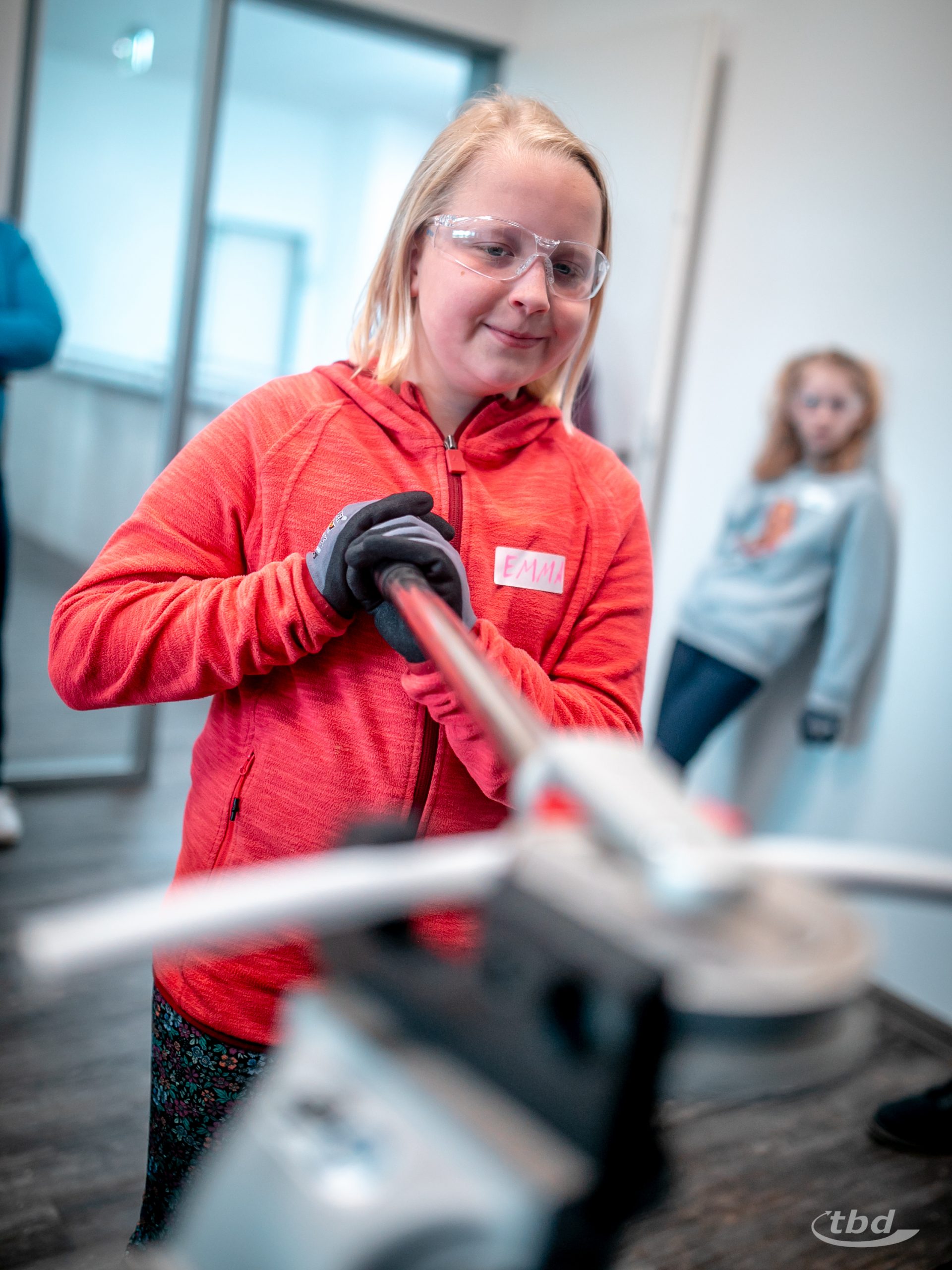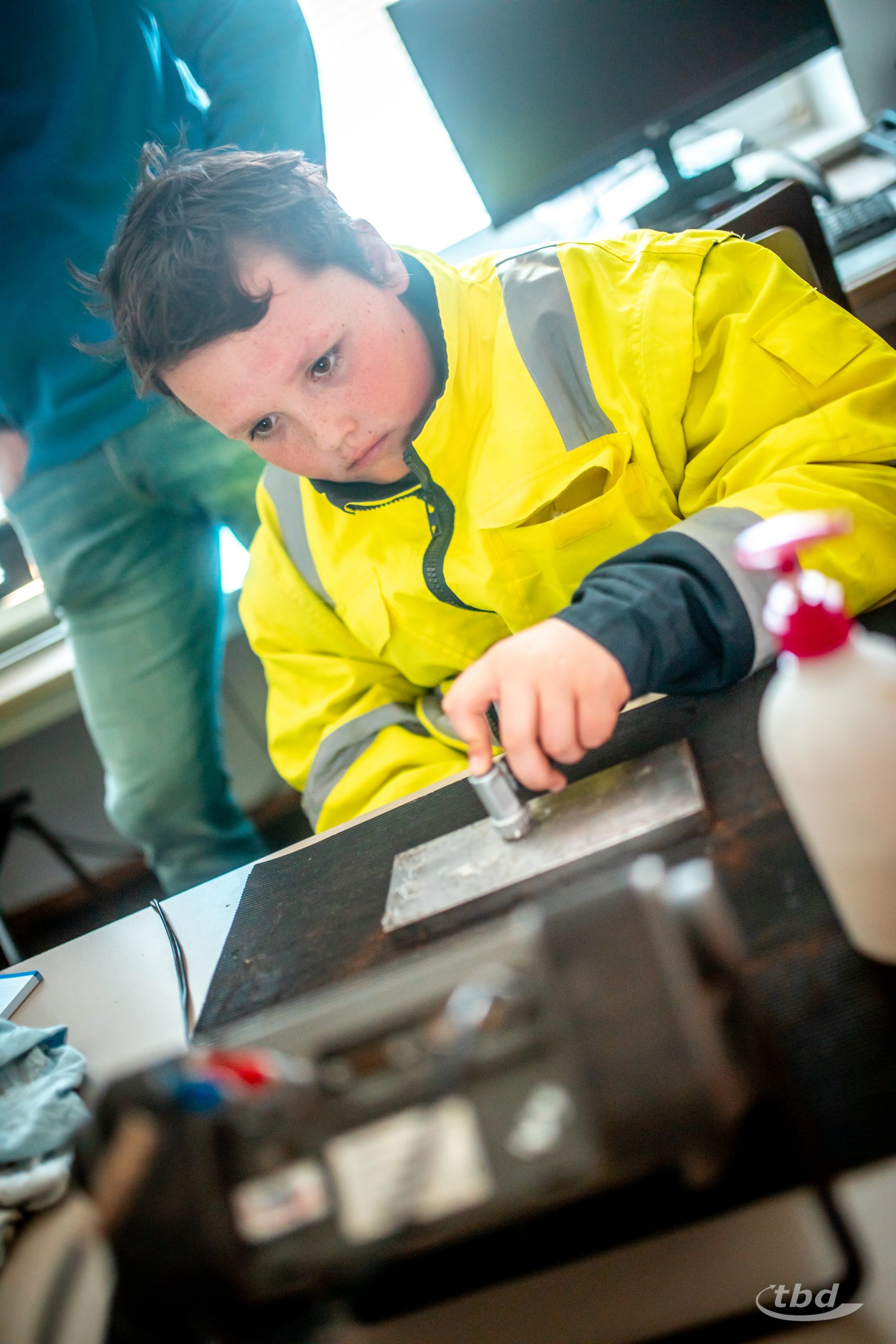 Und nun ging’s los. Gemeinsam mit unserem Haustechnik-SHK-Azubi Jannick konnten die Kinder Kupfer- und Alu-Verbund-Rohre biegen – was im Arbeitsalltag wichtig ist, wenn Heizungsrohre Hindernisse umkurven müssen. Parallel zeigte unser Projektleitungs-Trainee Johann, wie man ein Wasserrohr unter Druck anbohrt, ohne dass das kühle Nass durch die Gegend spritzt, und bei unserem angehenden Bauzeichner Joseph konnten die Kinder lernen und ausprobieren, wie Profis Baupläne richtig falten.