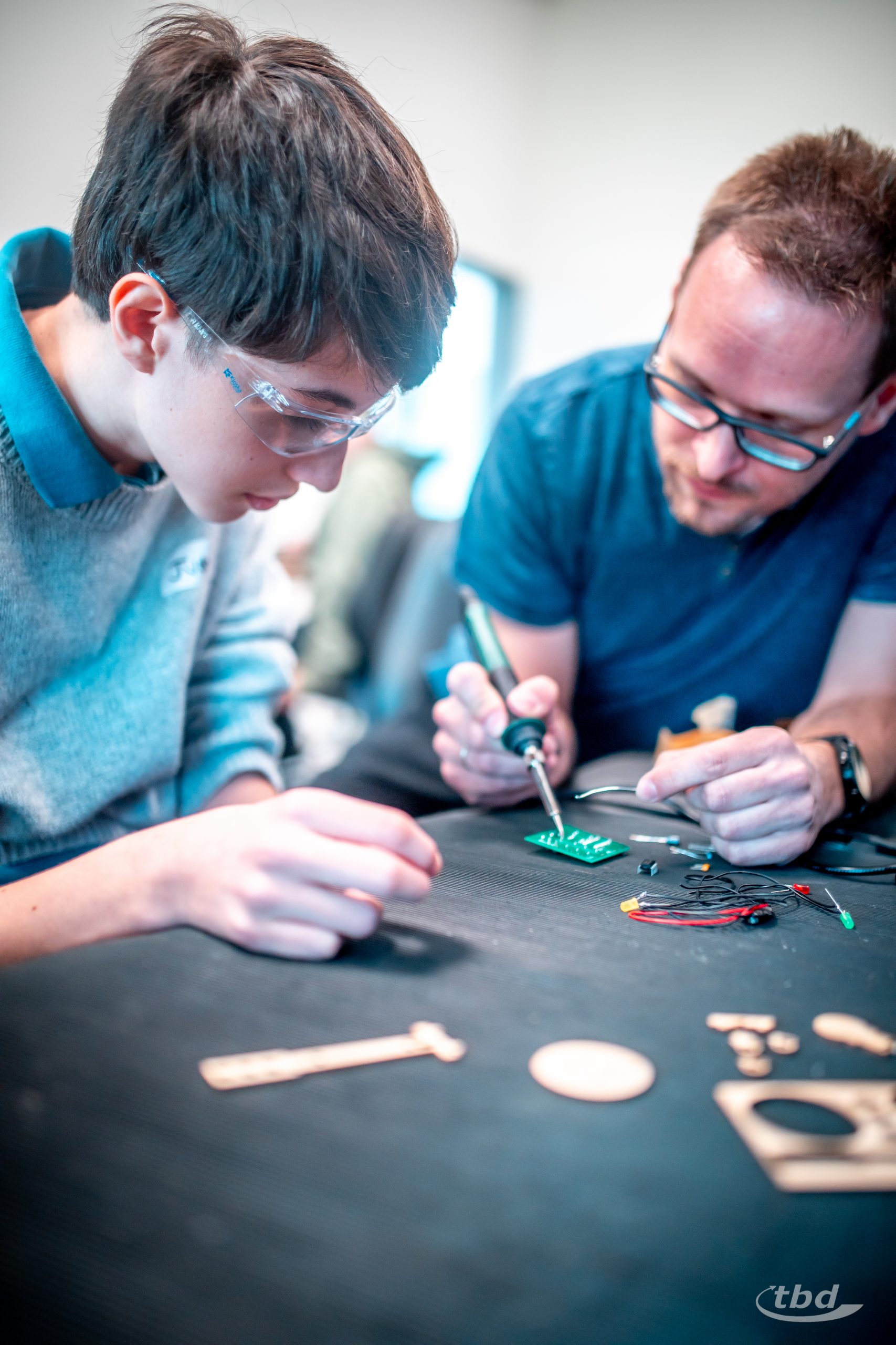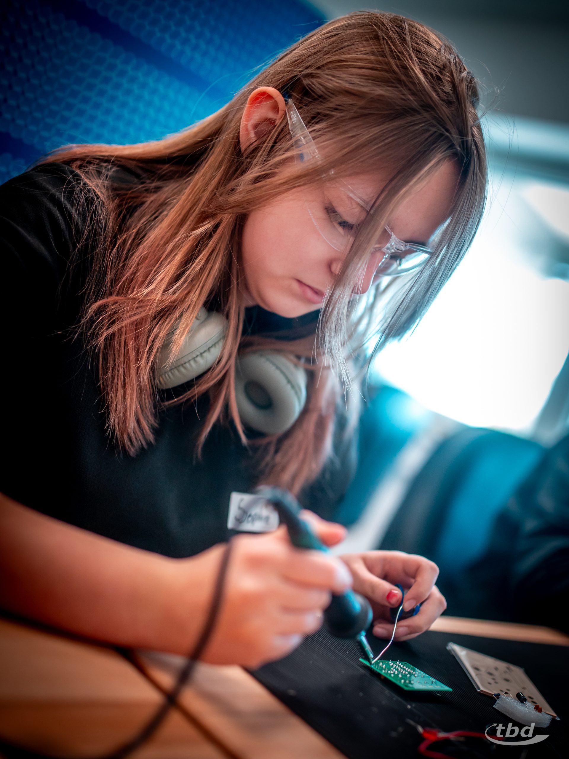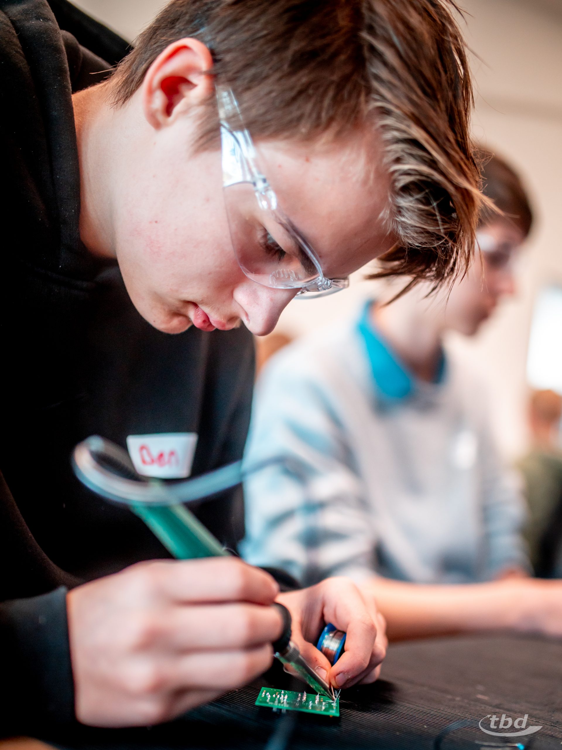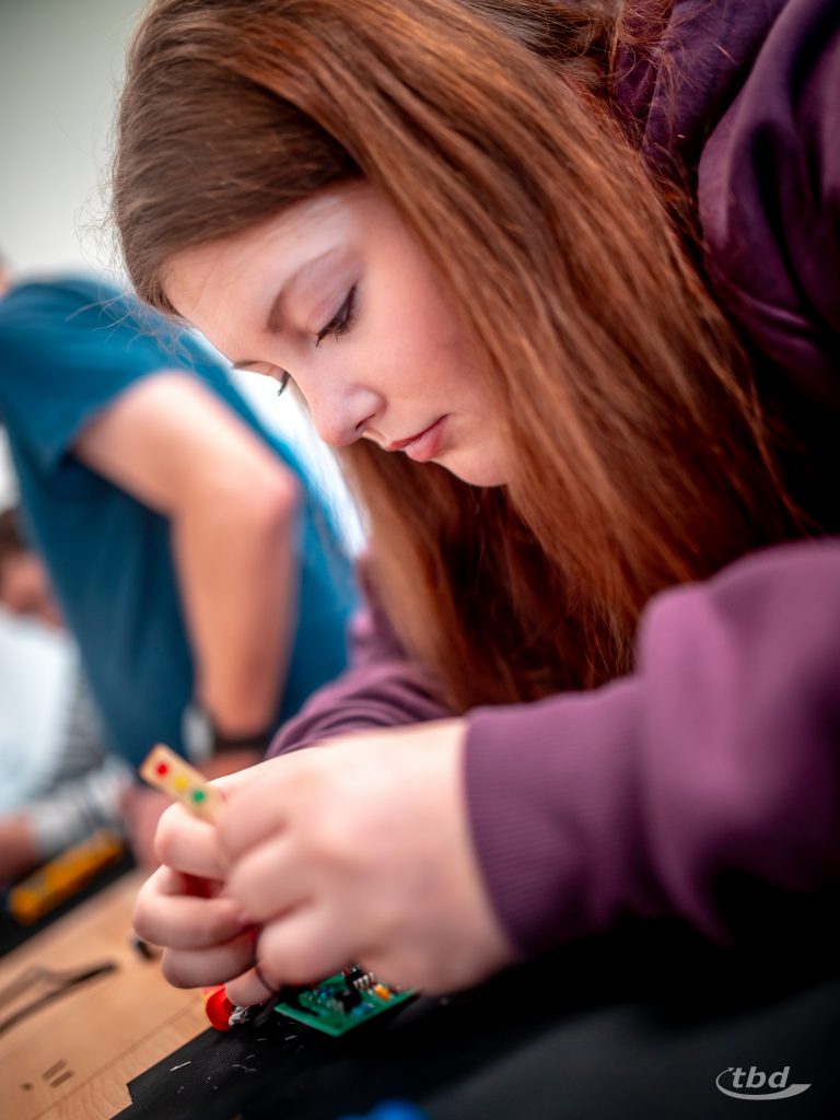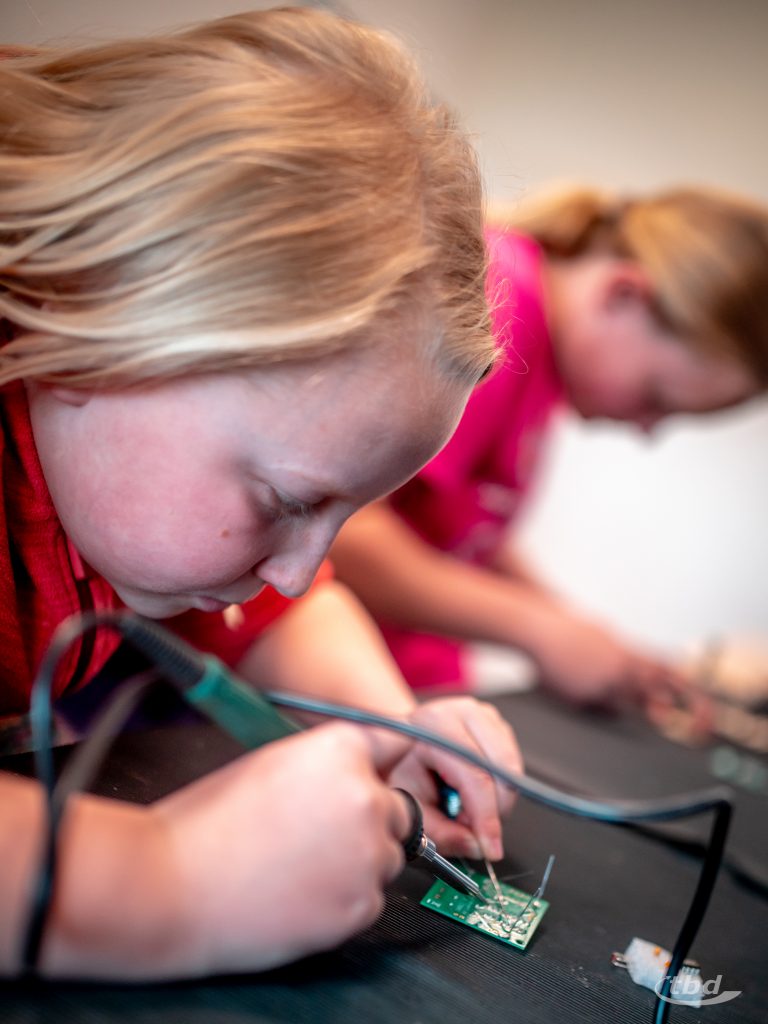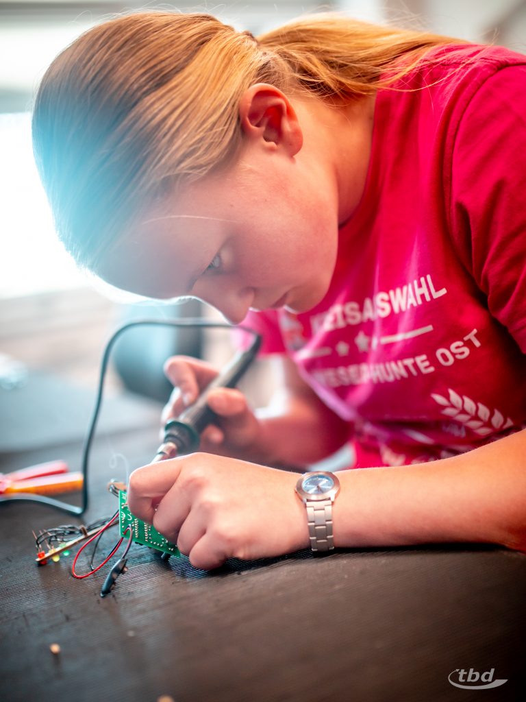 Bis zu 300° C heiß glühten die Spitzen von Lötkolben nebenan, und Amalia sagte: „Das ist ja Kochschinkentemperatur“ und lachte. Während sie bislang mit Lötkolben schonmal Muster in Holz gebrannt hatte, durfte sie jetzt wie alle anderen Kinder Lötzinn schmelzen gemeinsam mit unserem Ausbildungs-Koordinator Jan-Christoph Kondensatoren, integrierte Schaltkreise und andere Komponenten auf eine Platine löten, um sich eine eigene Ampel mit eigener Ampelschaltung zu bauen und später mit nach Hause nehmen zu können. „Löten ist super, ich glaub, ich will später einen Job, in dem ich auch löten darf“, sagt Amalia. Und Ben schwingt das Gerät besonders souverän und sagt: „Das macht mein Vater auch, der ist Glasfaser-Messbauführer“