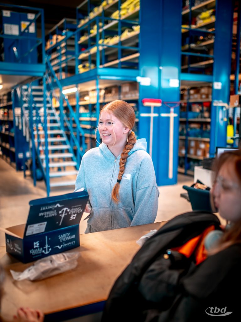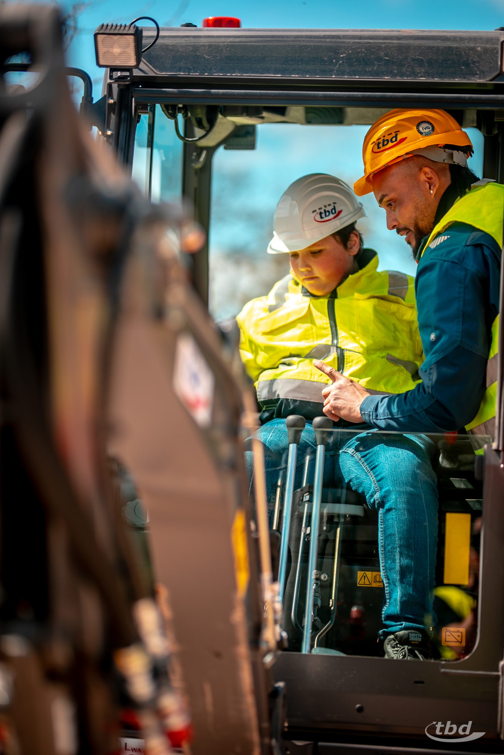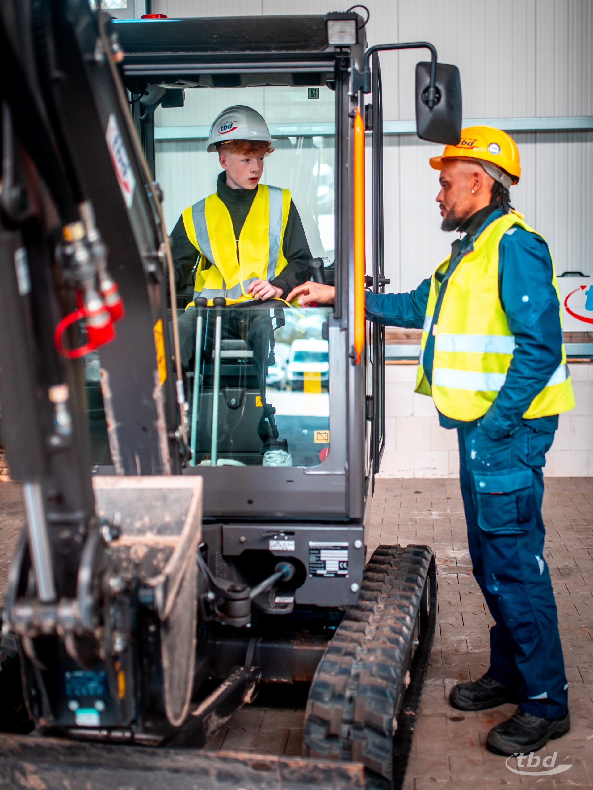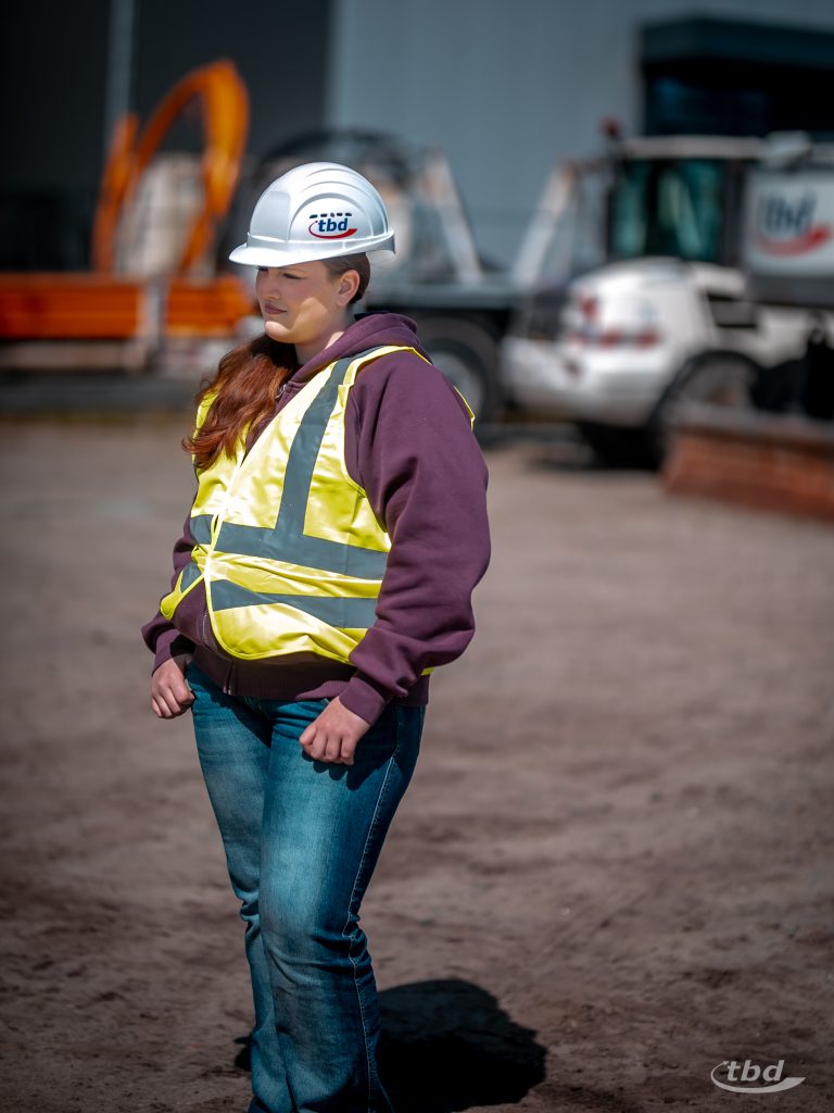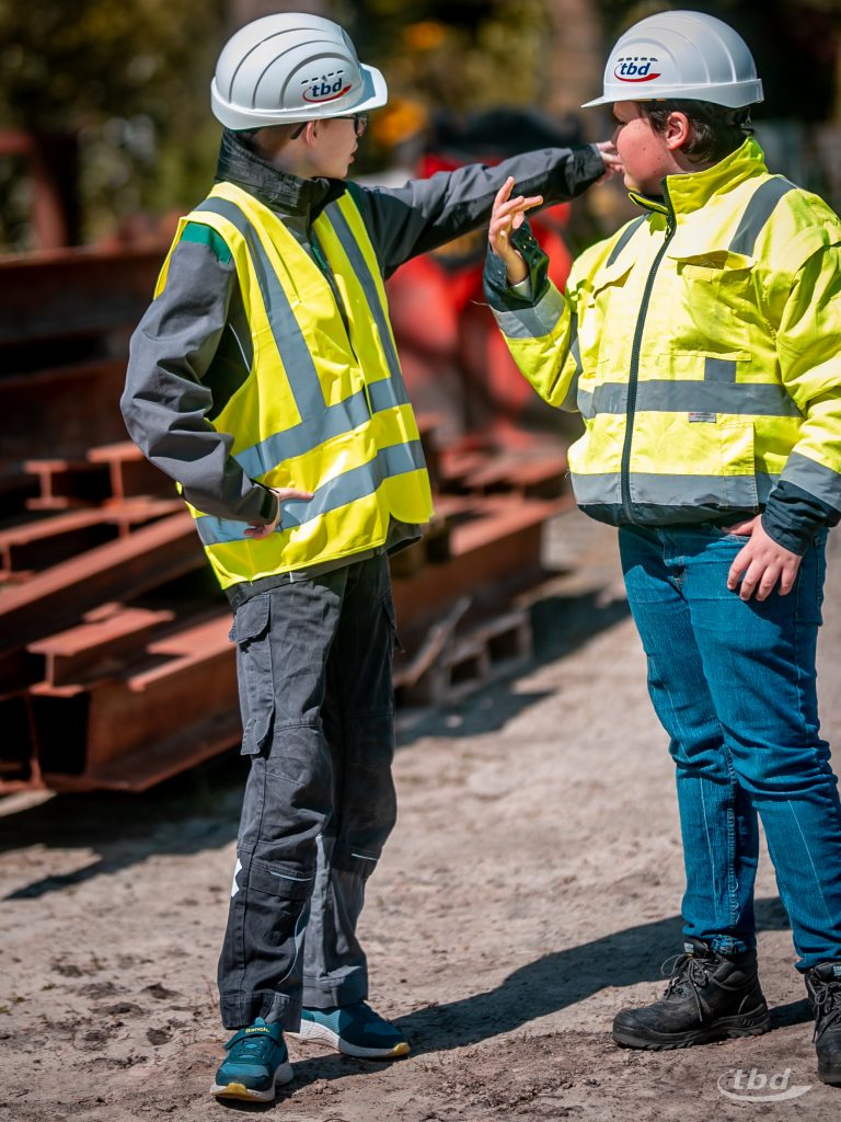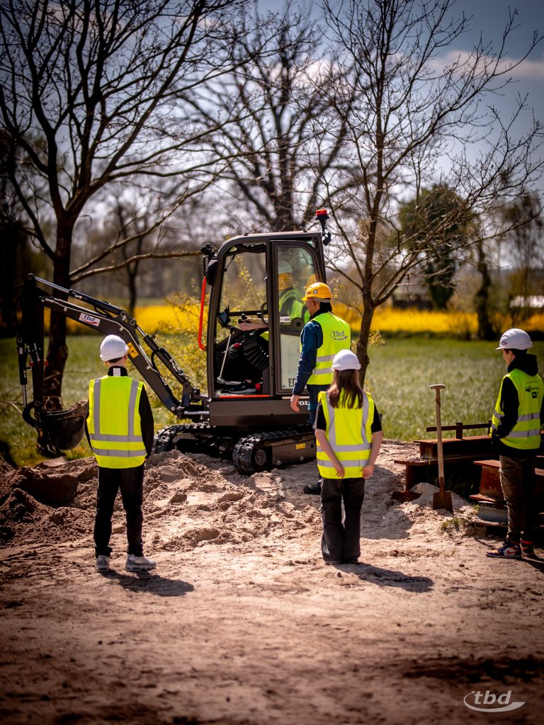 Bevor’s so richtig losging, gab’s ein gemeinsames Frühstück, konnten unsere neuen Kolleg:innen sich eigene Mitarbeiterausweise basteln, bekamen – wie es sich für Neuzugänge gehört – eine knackige Sicherheitsunterweisung und konnten sich am Ende eines ersten Rundgangs übers Firmengelände bei uns im Lager ihre persönliche Sicherheitsausrüstung für den Tag abholen: Schutzbrillen, Arbeitshandschuhe, Warnwesten, die brauchte nur einer nicht: Baumaschinen-Experte Ole war direkt in eigener Arbeitsjacke gekommen.