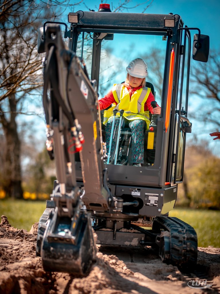 Und dann war da ja auch noch das Minibaggern, das Joachim von unseren zentralen Diensten den Kindern zeigte. Oder in einem Fall auch nicht erklären brauchte. Ole wusste schließlich schon Bescheid. Und sagte später: „Elektro-Minibagger fahren ist noch viel besser als Diesel. Vibriert nicht so stark, und es ist viel leiser, man muss nicht so schreien, wenn man sich verständigen will.“