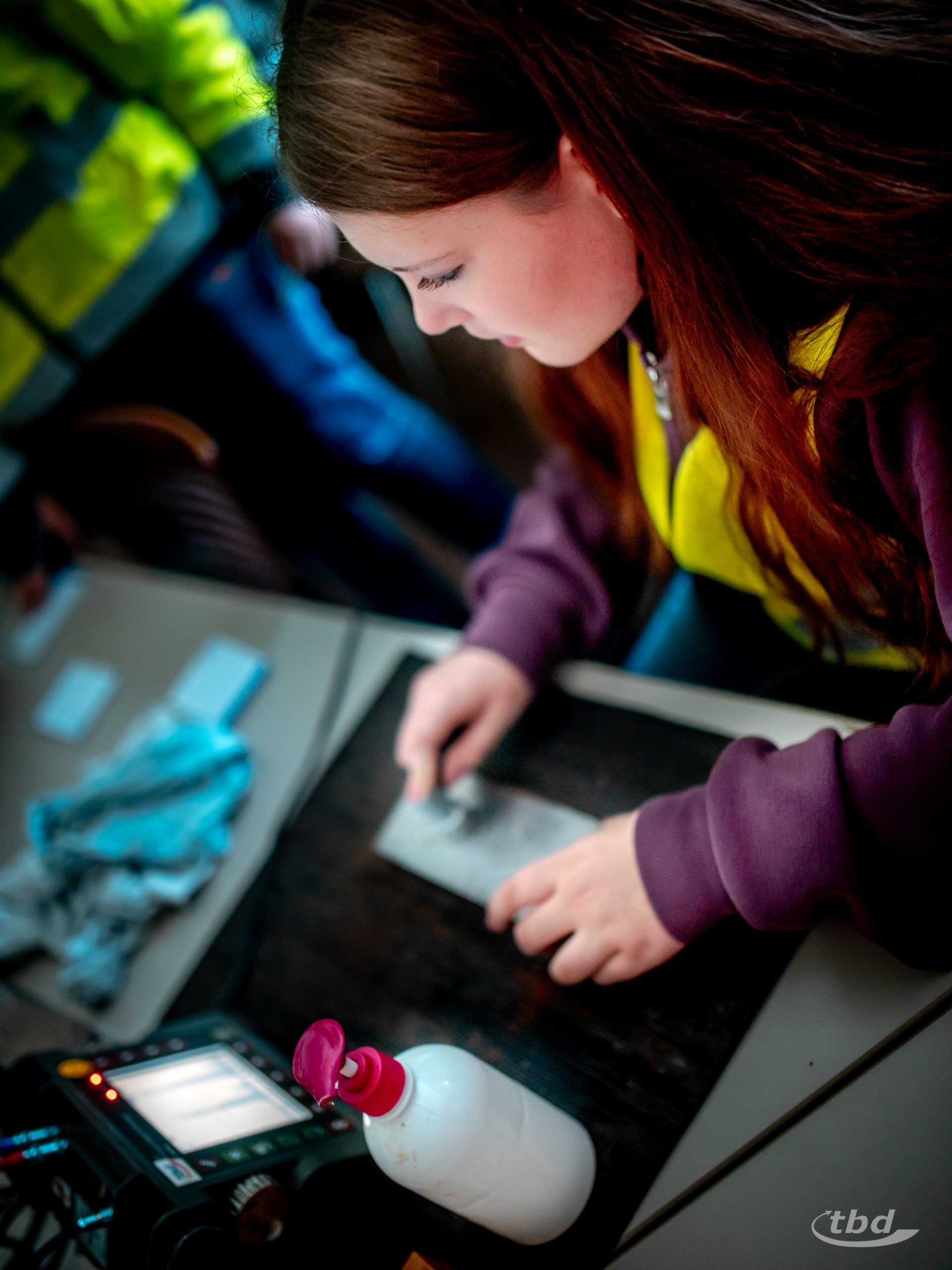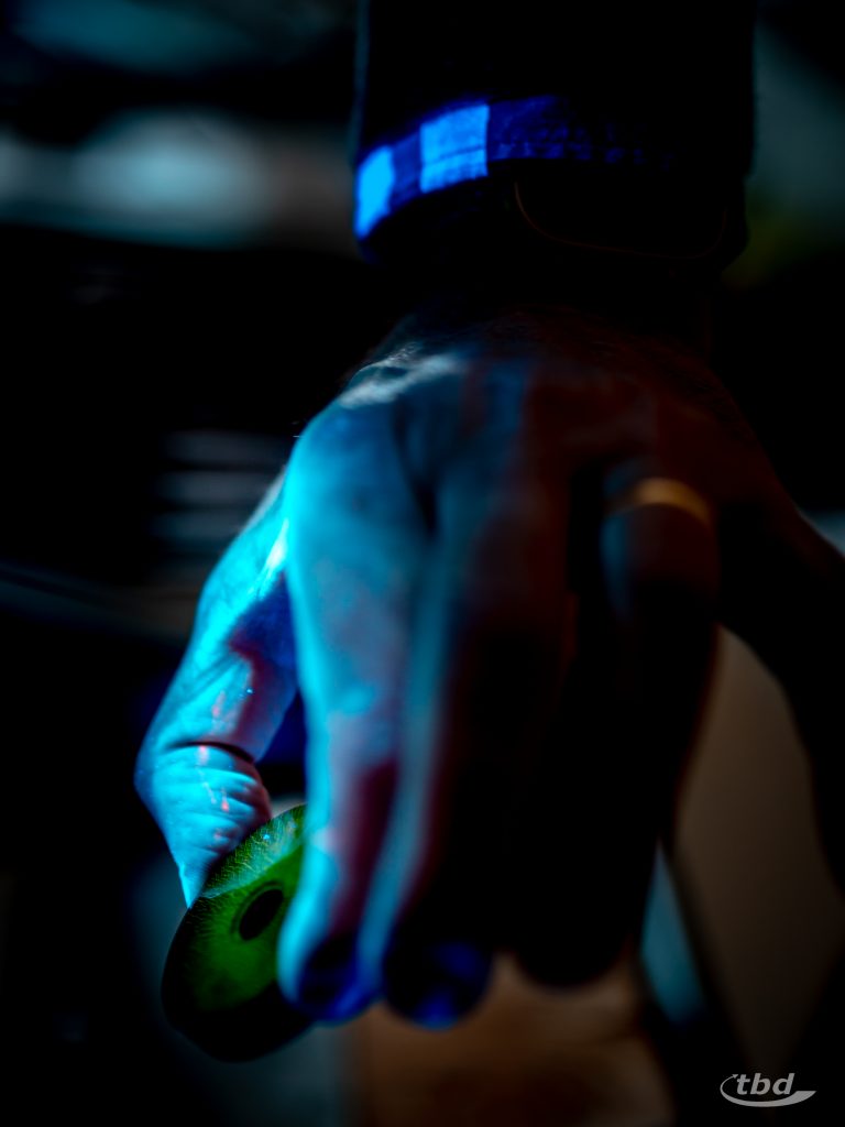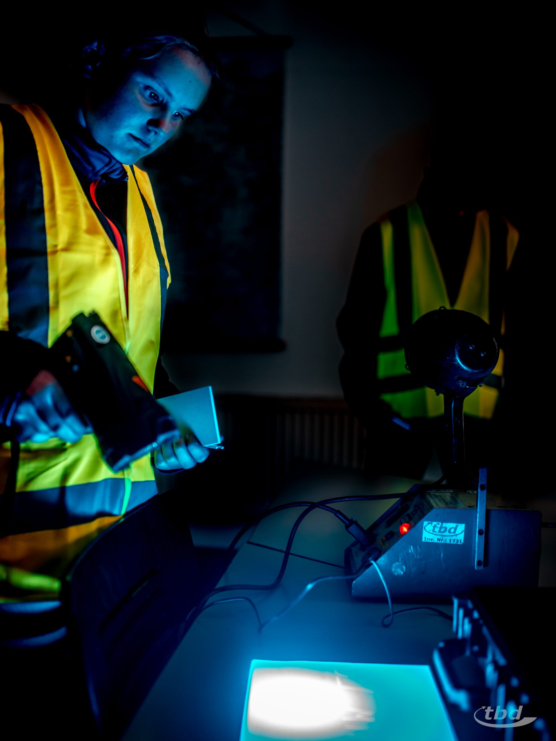 Sie konnten sich unter UV-Licht wie Augen leuchtende Testkörper für Magnetpulver-Suspensionen anschauen, plötzlich aufschimmernde Risse entdecken und das bei Tageslicht unsichtbare Codewort sichtbar machen. Um das Ganze abzurunden, zeigte Lars den Rallye-Teilnehmenden auch noch, wie die Laborwagen von innen aussehen, in denen die Aufnahmen entwickelt werden, die unsere Kolleg:innen von Schweißnähten an großen Stahlteilen machen – auf klassischem Film und digital.