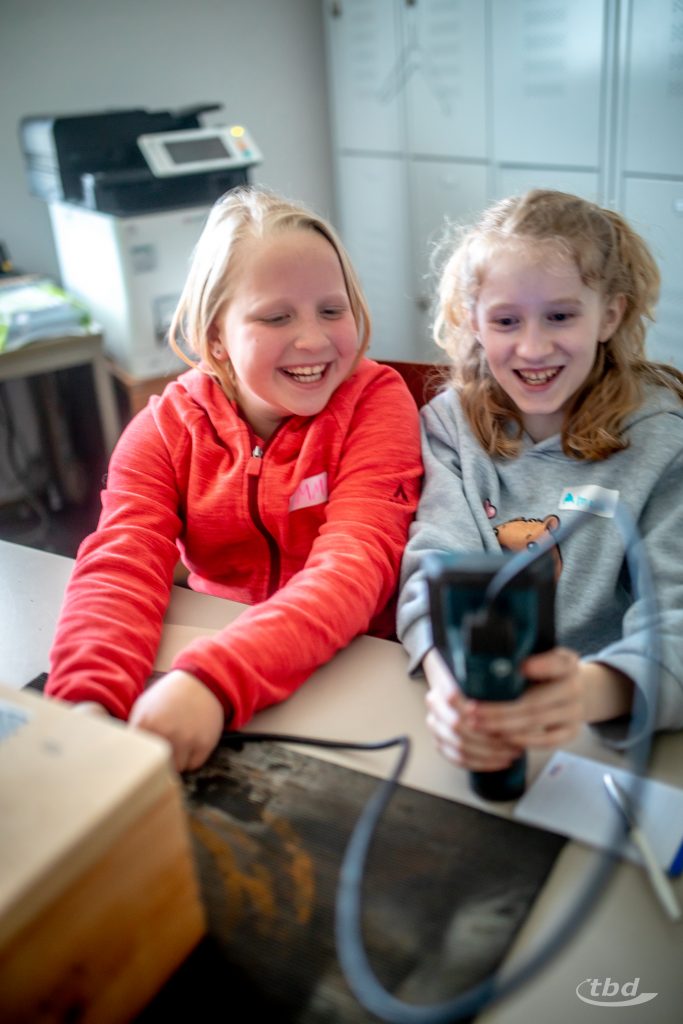 Und damit gestärkt, starteten die Kinder in die abschließenden Abenteuer: Schließlich hatten Laborleiter Lars und Rena noch einiges in petto, um zu zeigen und erleben zu lassen, was unsere Kollegen in der zerstörungsfreien Werkstoffprüfung alles tun: Die Kinder konnten mit einem Ultraschall-Prüfkopf ein Metallstück untersuchen und herausfinden, was für eine Form wir in die Unterseite gefräst haben. Sie konnten mit einer Kamera-Teleskopsonde in eine „Black Box“ schauen, in der sich ein mysteriöser Lego-Figuren-Autounfall ereignet hatte, und darin einen versteckten Buchstaben für ein Codewort suchen.